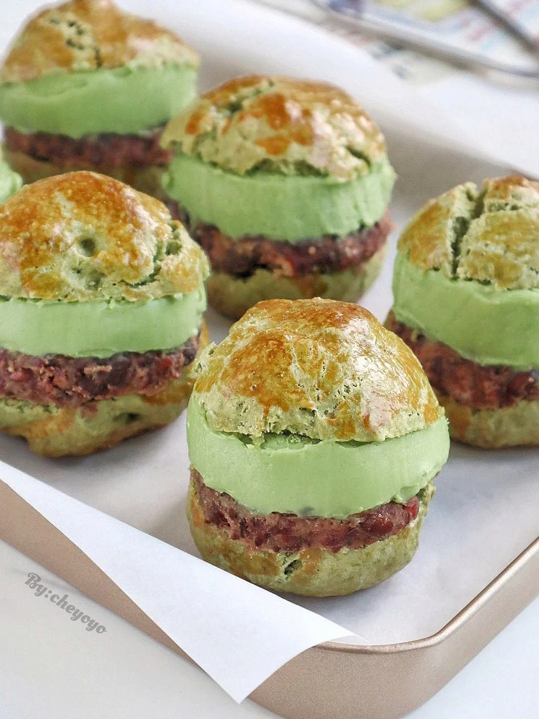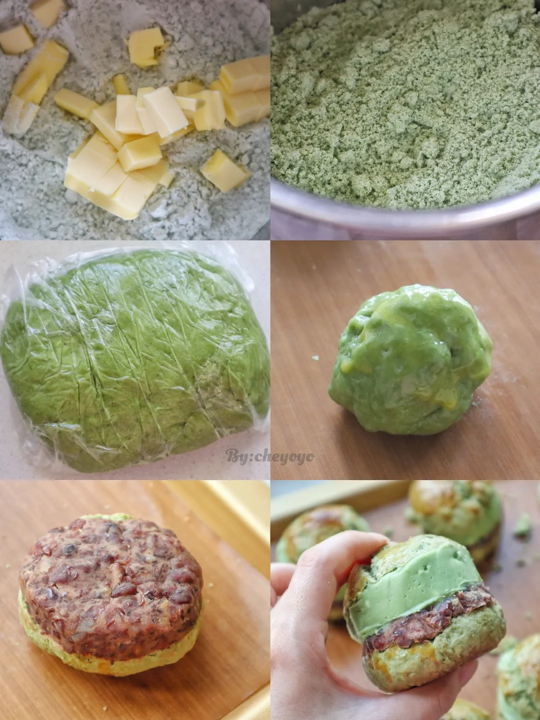 6⃣️司康从中间切开,抹上红豆馅,再挤上抹茶奶酪,抹平后在再盖上另一半就可以啦😌😌
