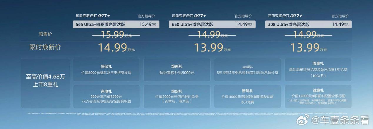 11月10日,在东风奕派品牌发布两周年之际,东风奕派eπ007+正式上市,限时焕新价13.99万元起,新车共推出增程308 Ultra+、纯电650 Ultra+与纯电565 Ultra+四驱三款车型,均标配激光雷达。
