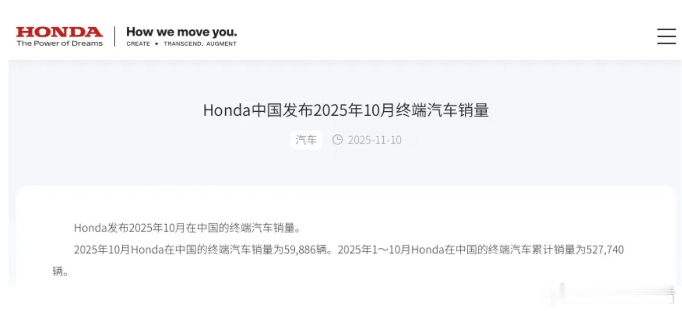 11 月 10 日,本田中国公布今年10月终端销量数据:单月销量 59886 辆,同比下滑 20.6%,这已是其今年连续第 10 个月销量同比下滑。