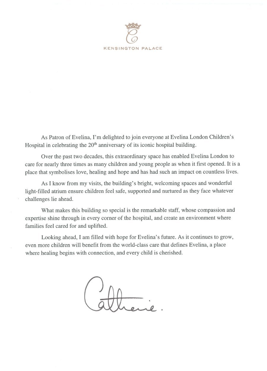 最新:伦敦Evelina儿童医院成立20周年之际,作为皇家赞助人(2018年成为其赞助人)的凯特发来了一封贺信📄~