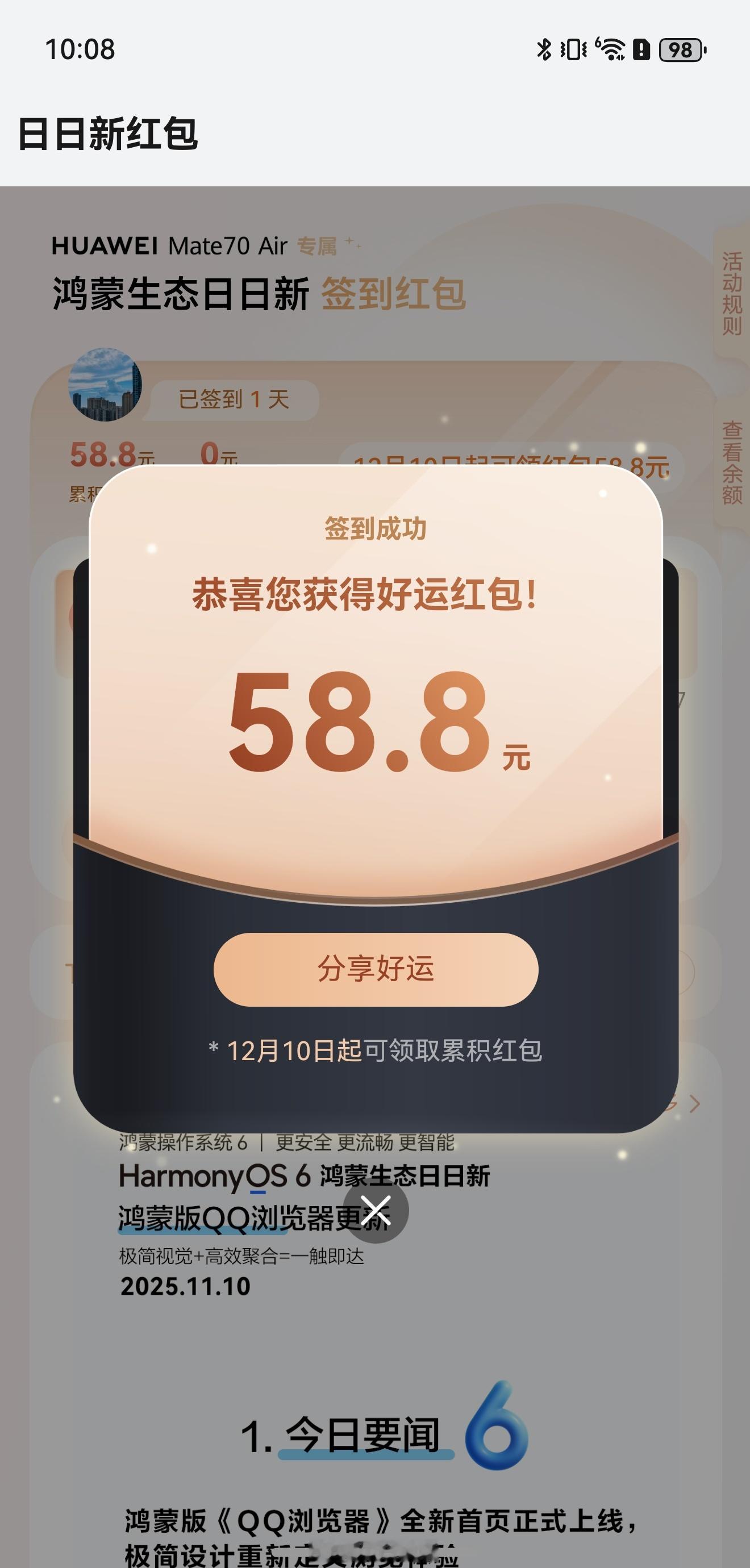 *鸿蒙有礼日日新签到领红包活动,华为新机-桌面滑动负一屏-鸿蒙有礼-新机专享-每日签到领红包即可进入。