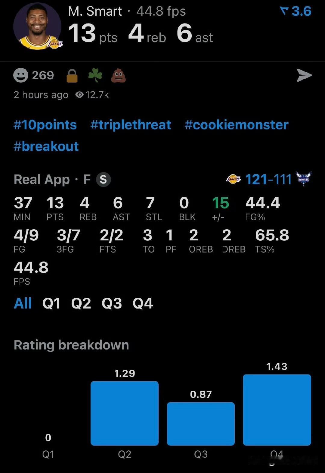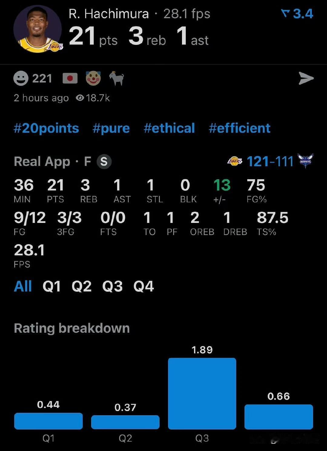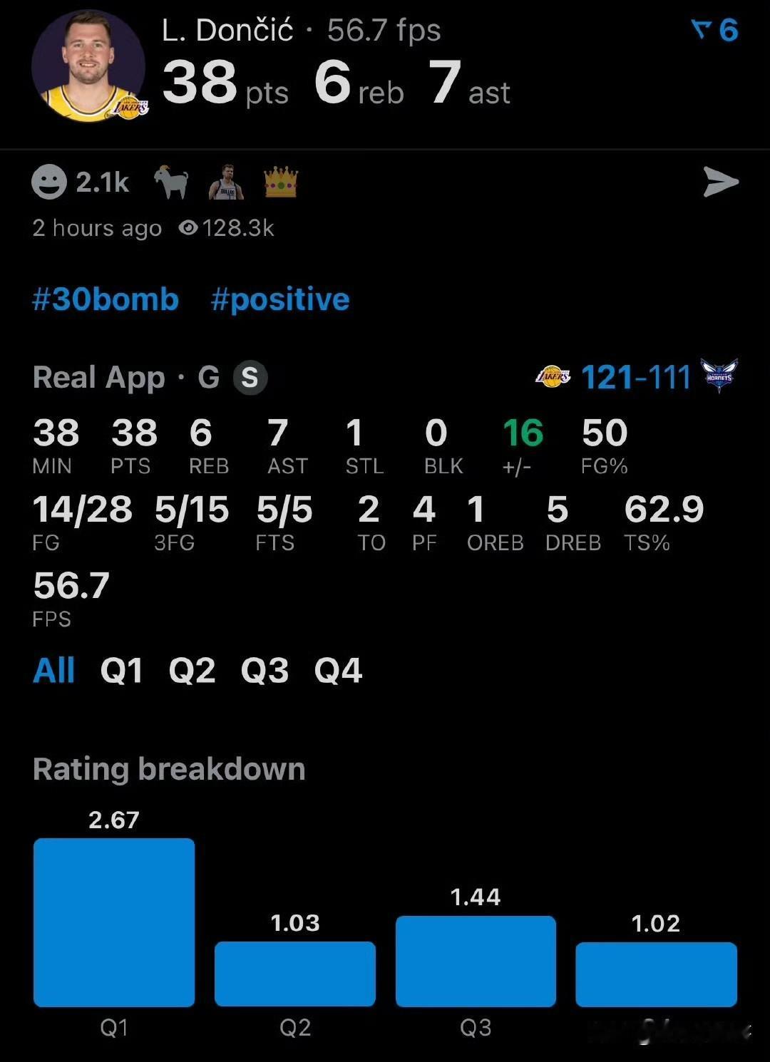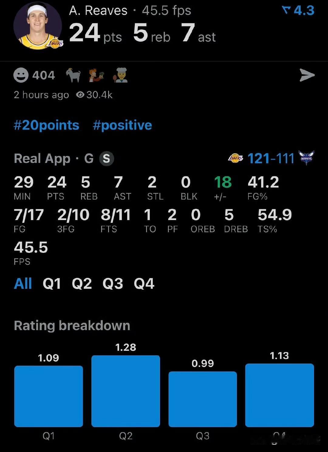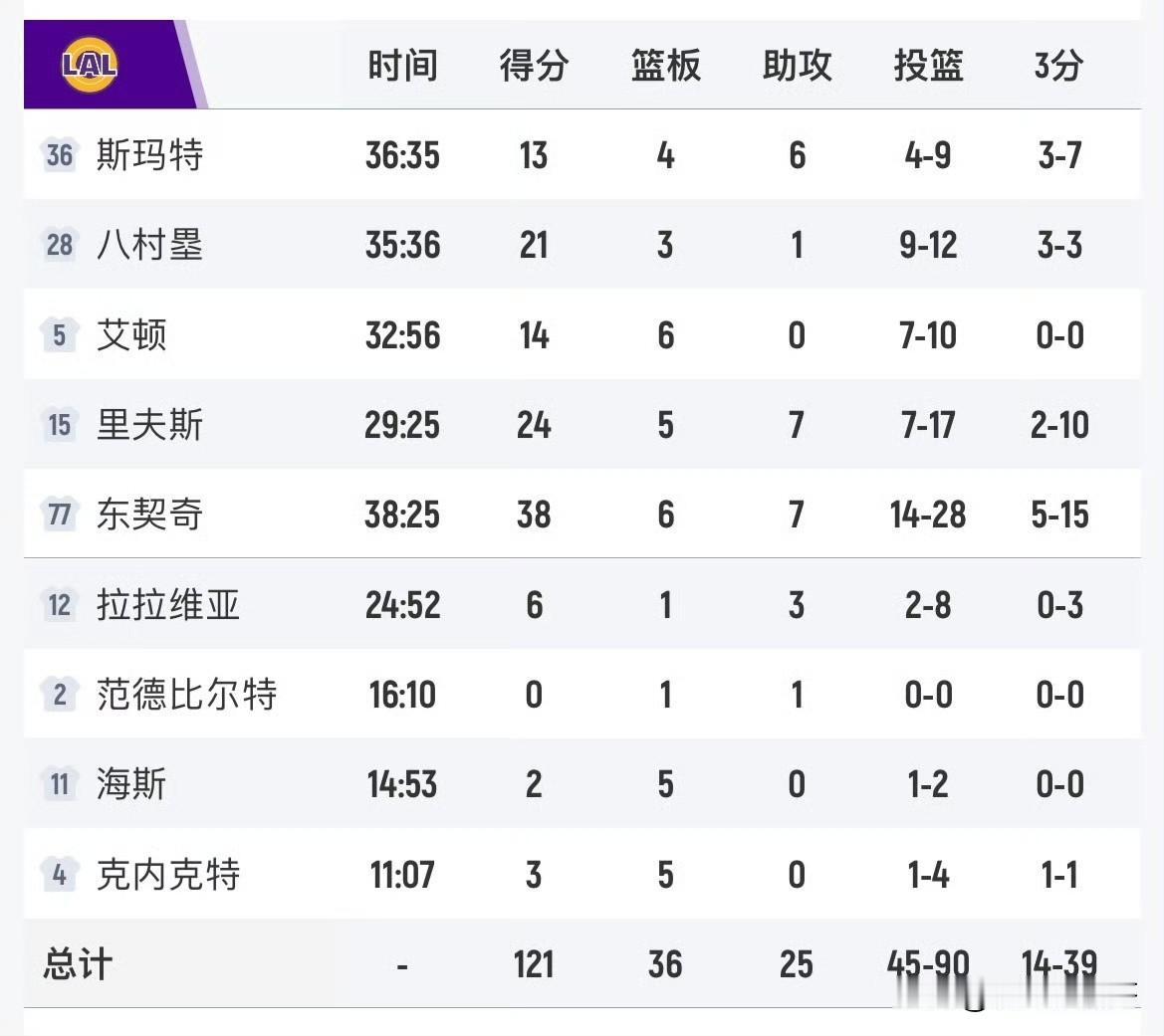 赢了,赢了!!!里夫斯复出砍24+5+7,斯玛特7次抢断,湖人获五连客首胜! 湖人今天完成了五连客的第二场比赛,没什么悬念,和预测的结果一致,湖人客场121-111战胜黄蜂。 本场比赛里夫斯迎来复出,他拿下24分5篮板7助攻的数据,看似数据不错,但是他的手感不佳,三分球只有10中2,20%的命中率。 东契奇常规操作,拿下38分6篮板7助攻,整体命中率有5成,但是三分只有15中5,三成的命中率很是拉垮。 本场比赛表现最亮眼的应该是斯玛平湖人纪录的七次抢断,这家伙防守的拼劲上来了。 黄蜂的新秀克尼佩尔今天手感不太好,不过也拿下了准三双的数据,小伙子很有前途。 恭喜湖人拿下比赛胜利,继续加油! 湖人赛程 湖人队里夫斯 湖人 里夫斯