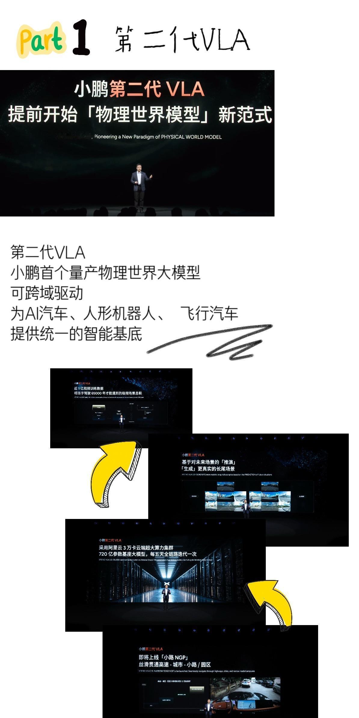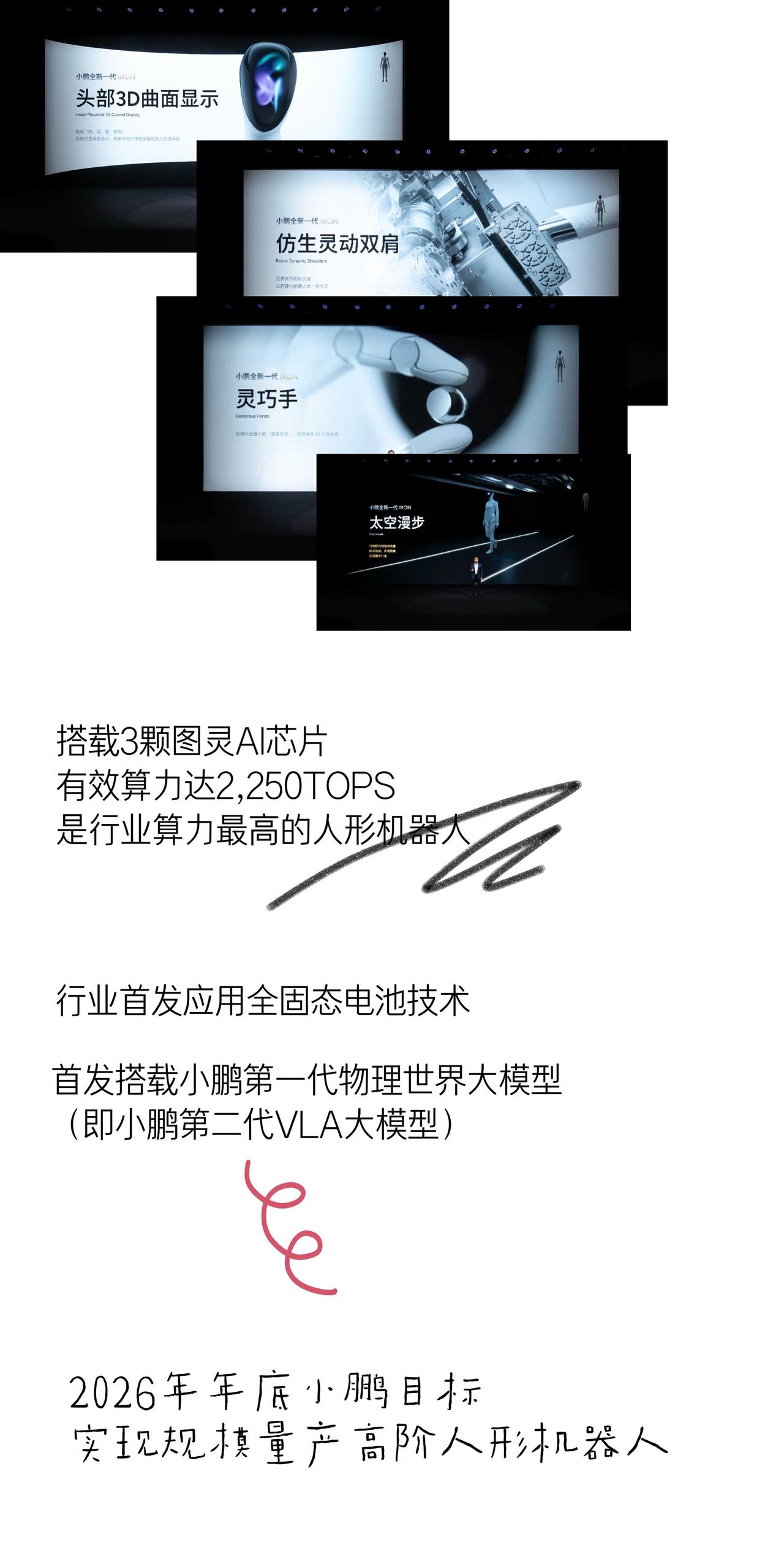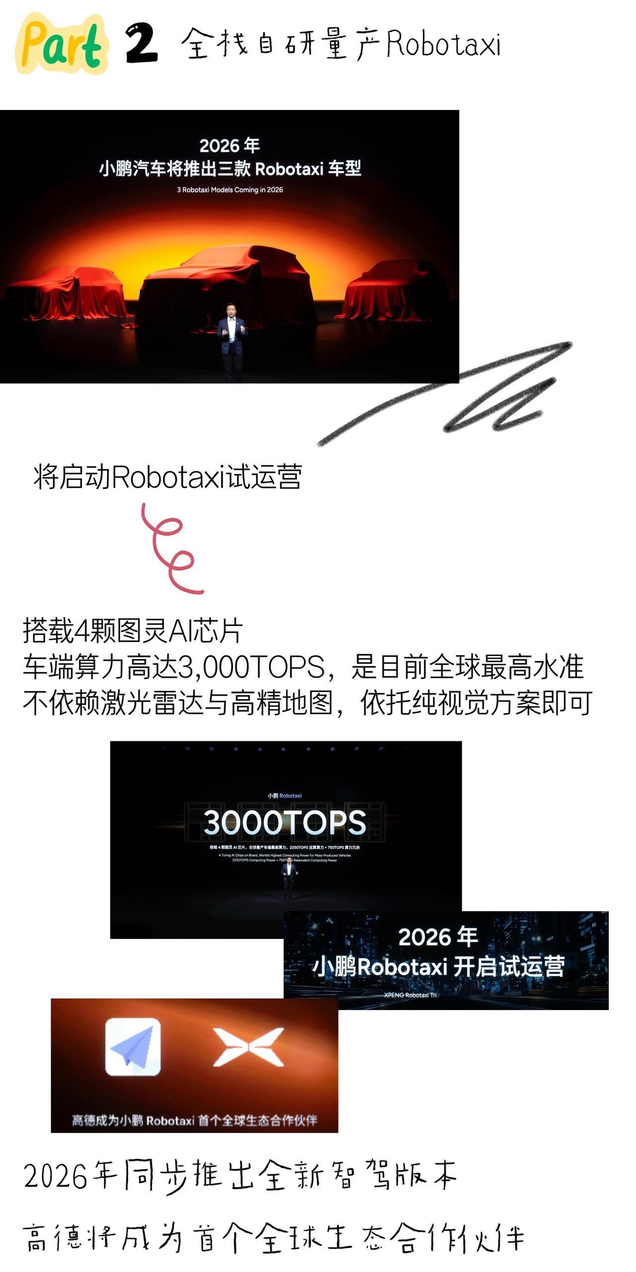 小鹏汽车的科技日还是很热闹的~补一个小鹏汽车科技日的内容 首先主题是“涌现 Emergence”,为什么是涌现呢?你要整体看来科技日发布会才能总结到,因为东西很多,且都快梦想照进现实了~ 第一,小鹏汽车正式推出第二代VLA,并且创新性去掉了“语言转译”环节,首次实现从视觉信号到动作指令的端到端直接生成。 第二代VLA的数据训练量接近1亿clips,相当于人类司机驾驶65,000年才能遇到的极限场景总和。 基于第二代VLA,小鹏汽车即将发布“小路NGP”功能,复杂小路的平均接管里程(MPI)提升了13倍。小鹏汽车还行业首发「无导航自动辅助驾驶」Super LCC+人机共驾。 2026年第一季度将面向小鹏Ultra车型全量推送第二代VLA。 第二,最有意思的是,Robotaxi 2026年推出三款 Robotaxi车型,同时还将启动Robotaxi试运营。(这个是最期待的) 搭载4颗图灵AI芯片,算力高达3,000TOPS,目前全球最高水准;不依赖激光雷达与高精地图,依托纯视觉方案即可应对全球不同道路类型及交通环境。 2026年小鹏汽车将同步推出全新智驾版本「Robo」,与Robotaxi同源。 小鹏Robotaxi将开放SDK,与全球伙伴共建 Robotaxi生态。何小鹏宣布:“高德将成为小鹏Robotaxi的首个全球生态合作伙伴。” 第三,全新一代IRON 小鹏全新一代IRON的设计理念是“由内而生”,它拥有仿人的脊椎、仿生肌肉、全包覆柔性皮肤,可支持不同身材体型定制。全身拥有82个自由度,采用行业最小的「谐波关节」才能拥有1:1人手尺寸,且手有22个自由度。 全新一代IRON还行业首发应用全固态电池,全新一代IRON搭载3颗图灵AI芯片,有效算力2250TOPS,首发搭载小鹏第一代物理世界大模型,通过构建「VLT + VLA + VLM」的高阶大小脑能力组合。 何小鹏表示:“2026年年底,小鹏目标实现规模量产高阶人形机器人。” 第四,小鹏飞行器 陆地航母已正式进入量产前夜,目前全球订单累计突破7,000 台创下行业纪录。 汇天飞行汽车量产工厂已于11月3日试产并顺利下线首台陆地航母飞行器。规划年产能10,000辆,初期年产能5,000辆。小鹏科技日 小鹏汽车 小鹏机器人 小鹏汇天飞行汽车 @小鹏汽车