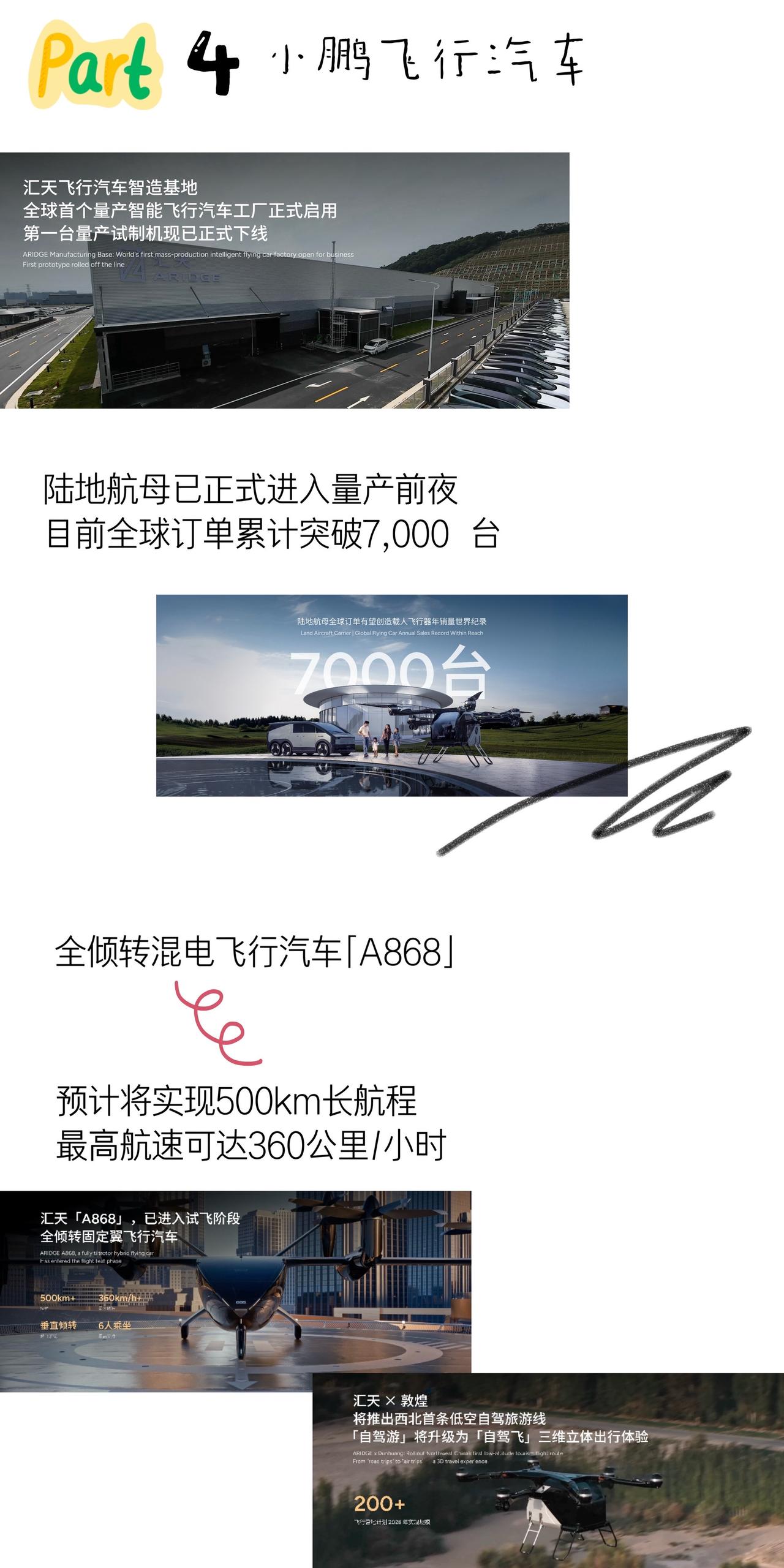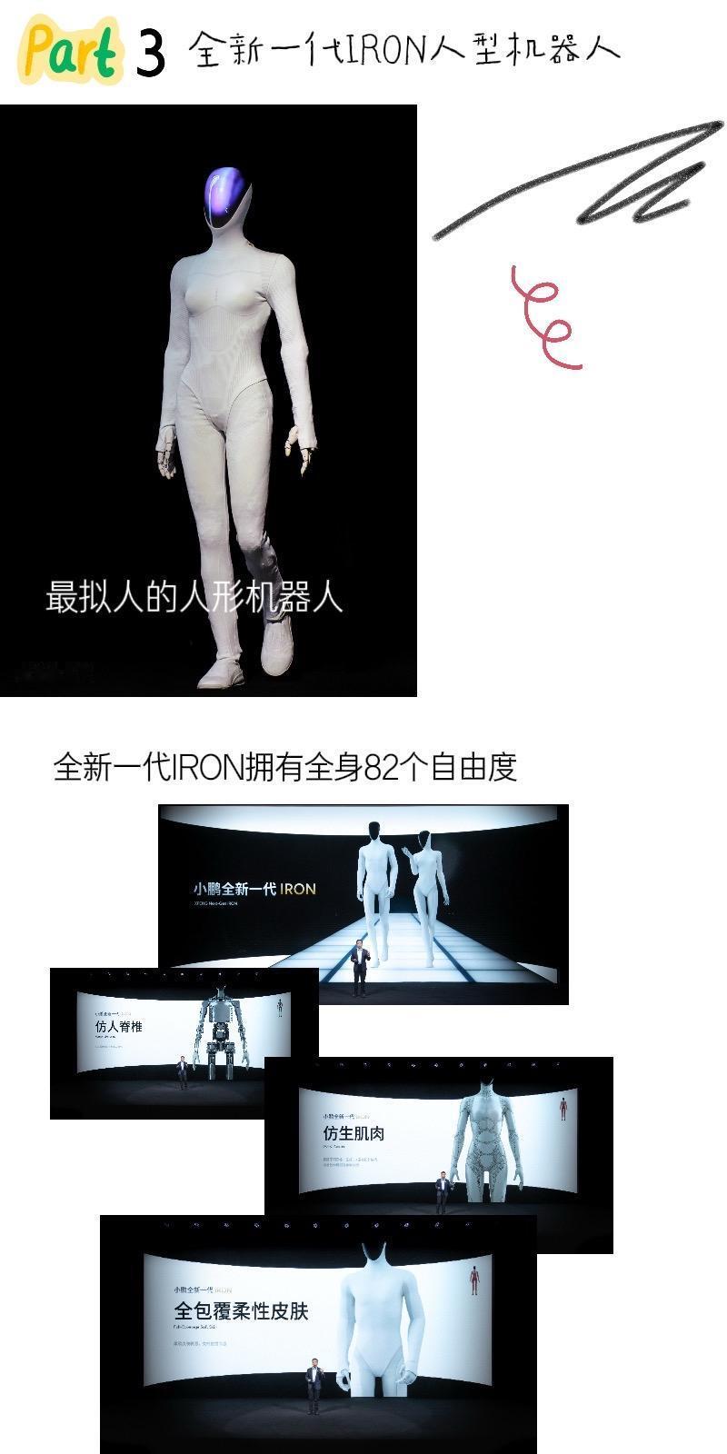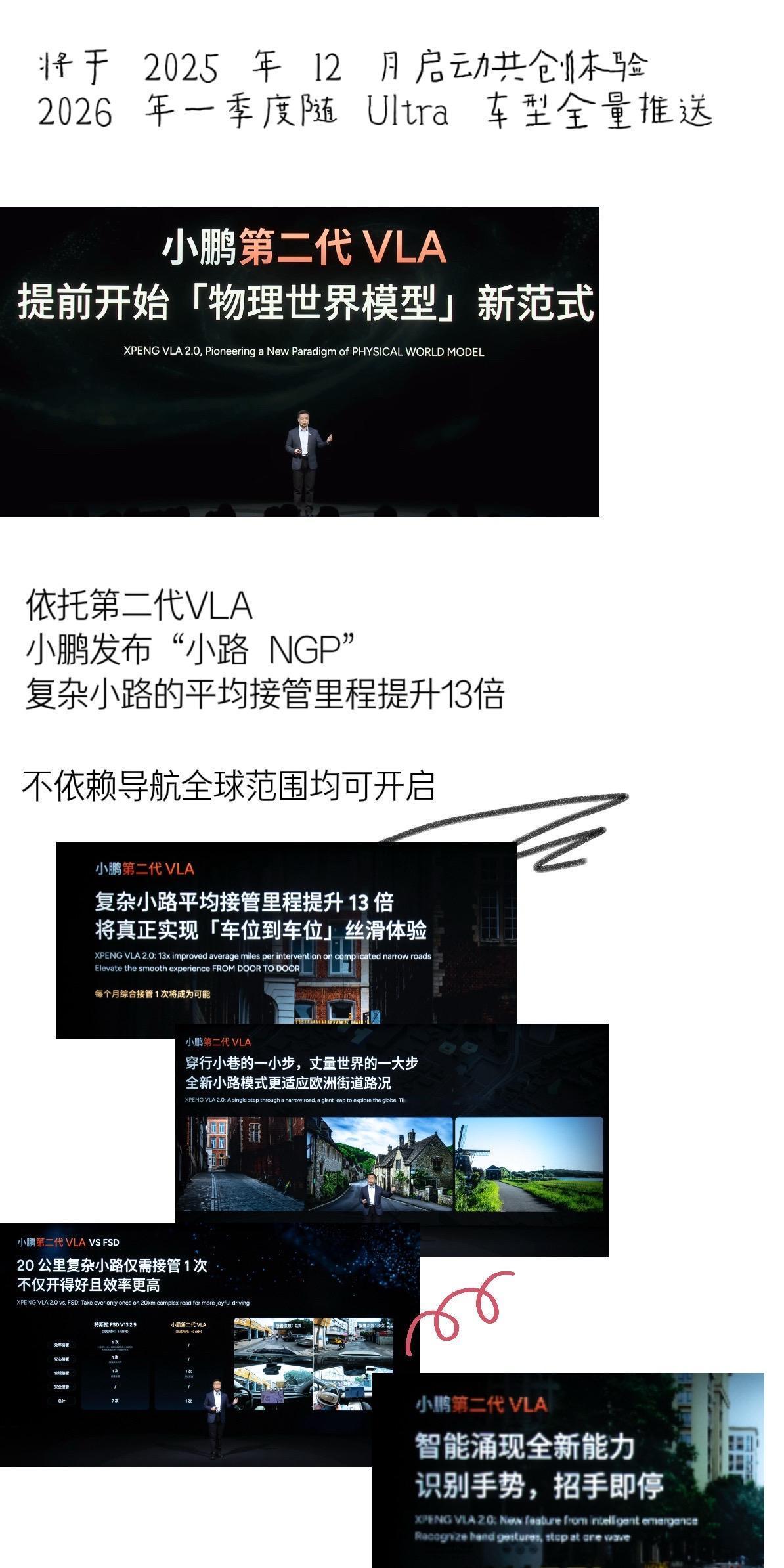 小鹏汽车的科技日还是很热闹的~补一个小鹏汽车科技日的内容 首先主题是“涌现 Emergence”,为什么是涌现呢?你要整体看来科技日发布会才能总结到,因为东西很多,且都快梦想照进现实了~ 第一,小鹏汽车正式推出第二代VLA,并且创新性去掉了“语言转译”环节,首次实现从视觉信号到动作指令的端到端直接生成。 第二代VLA的数据训练量接近1亿clips,相当于人类司机驾驶65,000年才能遇到的极限场景总和。 基于第二代VLA,小鹏汽车即将发布“小路NGP”功能,复杂小路的平均接管里程(MPI)提升了13倍。小鹏汽车还行业首发「无导航自动辅助驾驶」Super LCC+人机共驾。 2026年第一季度将面向小鹏Ultra车型全量推送第二代VLA。 第二,最有意思的是,Robotaxi 2026年推出三款 Robotaxi车型,同时还将启动Robotaxi试运营。(这个是最期待的) 搭载4颗图灵AI芯片,算力高达3,000TOPS,目前全球最高水准;不依赖激光雷达与高精地图,依托纯视觉方案即可应对全球不同道路类型及交通环境。 2026年小鹏汽车将同步推出全新智驾版本「Robo」,与Robotaxi同源。 小鹏Robotaxi将开放SDK,与全球伙伴共建 Robotaxi生态。何小鹏宣布:“高德将成为小鹏Robotaxi的首个全球生态合作伙伴。” 第三,全新一代IRON 小鹏全新一代IRON的设计理念是“由内而生”,它拥有仿人的脊椎、仿生肌肉、全包覆柔性皮肤,可支持不同身材体型定制。全身拥有82个自由度,采用行业最小的「谐波关节」才能拥有1:1人手尺寸,且手有22个自由度。 全新一代IRON还行业首发应用全固态电池,全新一代IRON搭载3颗图灵AI芯片,有效算力2250TOPS,首发搭载小鹏第一代物理世界大模型,通过构建「VLT + VLA + VLM」的高阶大小脑能力组合。 何小鹏表示:“2026年年底,小鹏目标实现规模量产高阶人形机器人。” 第四,小鹏飞行器 陆地航母已正式进入量产前夜,目前全球订单累计突破7,000 台创下行业纪录。 汇天飞行汽车量产工厂已于11月3日试产并顺利下线首台陆地航母飞行器。规划年产能10,000辆,初期年产能5,000辆。小鹏科技日 小鹏汽车 小鹏机器人 小鹏汇天飞行汽车 @小鹏汽车
