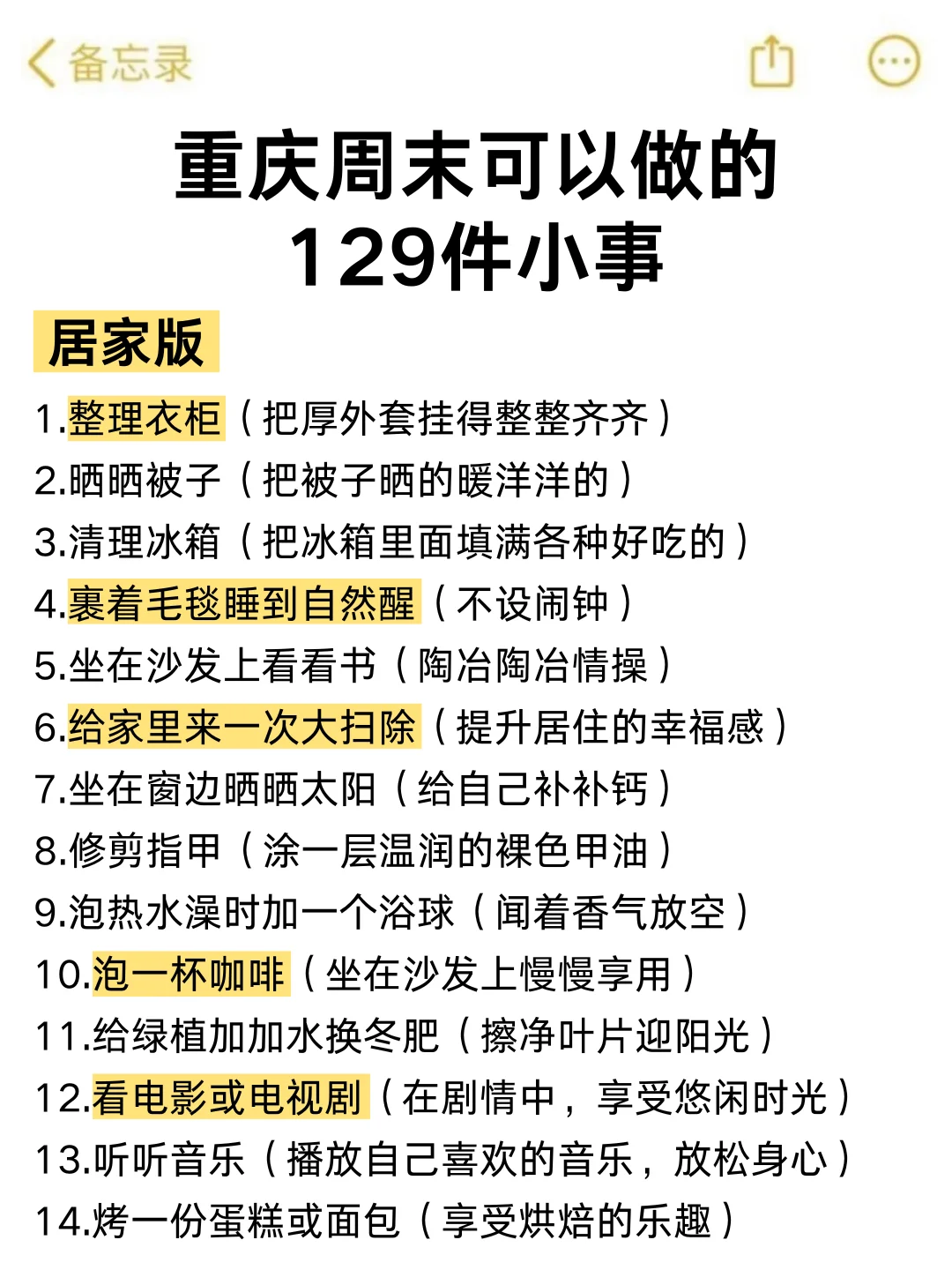 还有谁在抱怨周末在家无聊的🥺给你们一些周末不无聊的小灵感~🐴住!!无聊时候拿出来参考下~ - 👌更多攻略看:盒止于礼全国游记 重庆知道重庆旅游美食重庆火锅朱一龙同款重庆本地人推荐火锅唐红英火锅重庆社区美食重庆吃喝玩乐周末去哪玩重庆观音桥重庆旅游路线重庆小众旅游重庆旅游住宿重庆烤鱼
