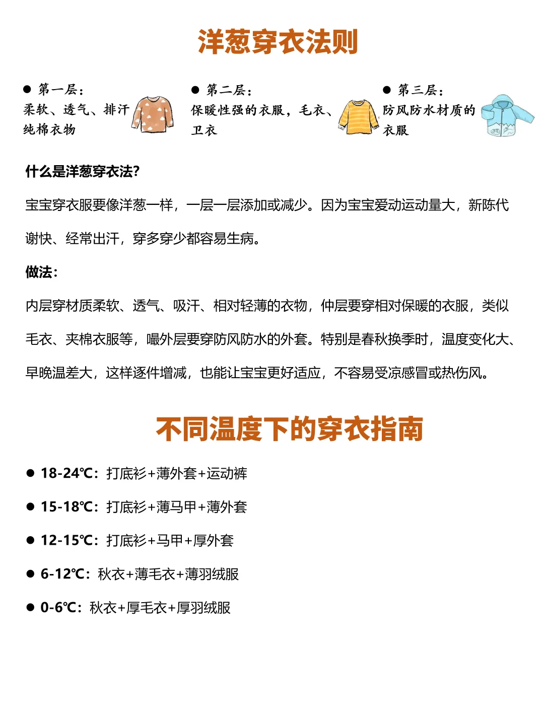 内层穿材质柔软、透气、吸汗、相对轻薄的衣物,中间要穿相对保暖的衣服,类似毛衣、夹棉衣服等,外层要穿防风防水的外套。特别是春秋换季时,温度变化大、早晚温差大,这样逐件增减,也能让宝宝更好适应,不容易受凉感冒或热伤风。