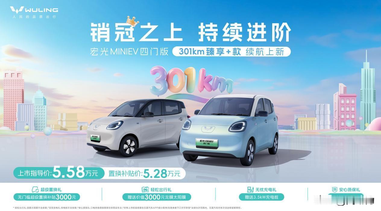 宏光MINIEV长续航四门版上市!续航达301km,出行无焦虑? 近日,五菱公