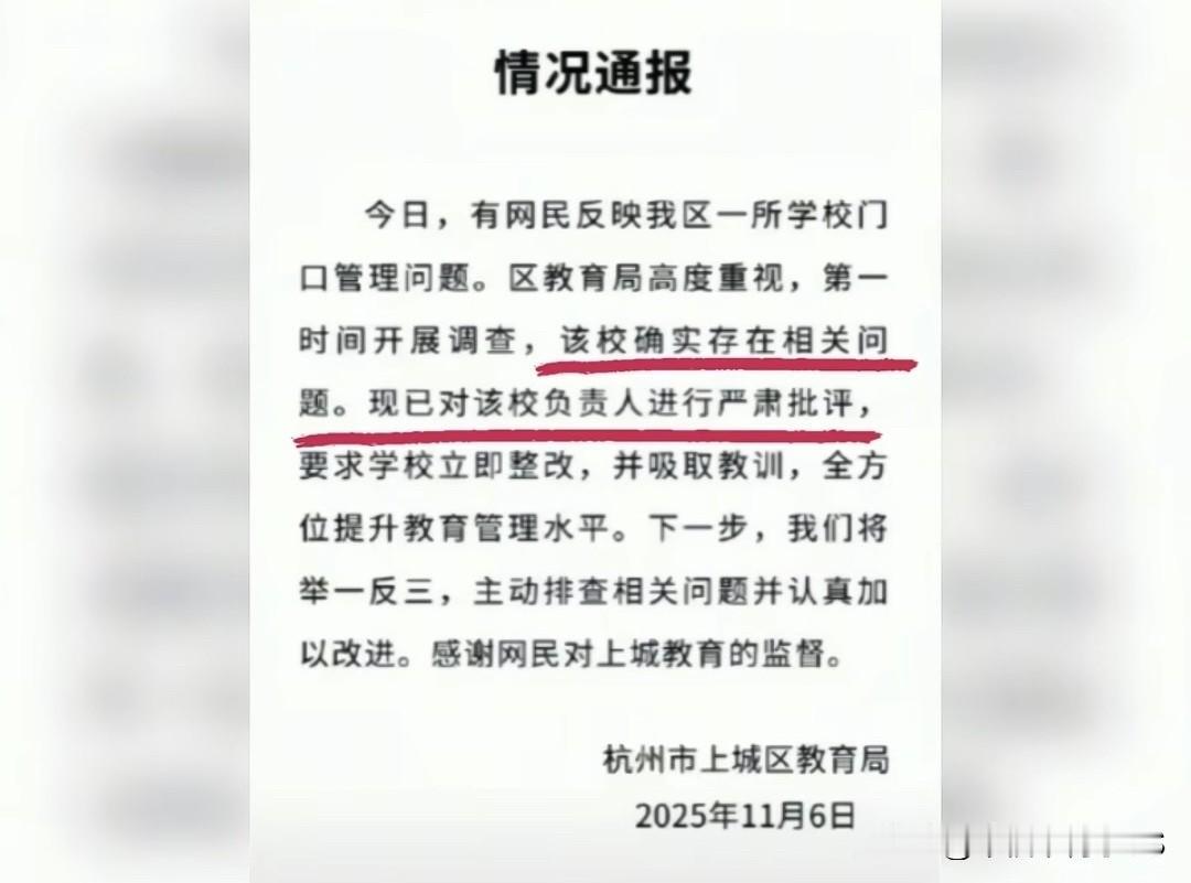 杭州某学校门口,学生们站在大门两侧,对着进校门的车辆一边敬礼一边喊“老师好”。短短50秒,10辆车进校门,学生就喊了10遍 有网友觉得,按照基本礼节,老师至少得开窗回应一下吧。而且学生们在旁边走廊排队进校,老师却走“VIP”通道开车进,大冷天的让孩子起这么早,就为了干这耗时耗力又没啥意义的事,网友们都炸锅了,直言这老师太威风。 学校一开始说这是发布者恶意剪辑,还报了警。结果当地教育局很快就通报了,说学校确实存在问题,已经严肃批评了负责人,要求立即整改。 不少网友不光是为孩子觉得不公,更是从孩子身上看到了自己在生活和工作里的影子,被迫做着自己不喜欢的事。