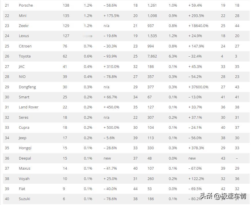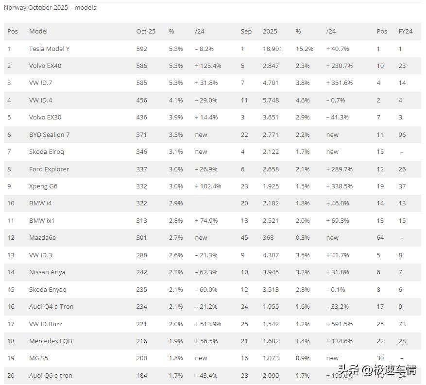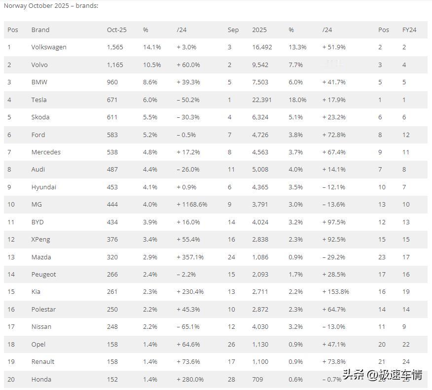 十月,挪威车市纯电(BEV)汽车以97.4%的份额再次刷新全球纪录,在转型纯电的浪潮中遥遥领先。2026年1月1日起,电动车25%增值税的免税起征点将从50万挪威克朗降至30万,预计年底前将出现电动车抢购潮。名爵、小鹏、比亚迪等中国品牌的集体爆发,推动中国品牌份额高达17.1%。 2025年10月,挪威新车销量同比下滑3.6%,至11,138辆。 2025年1-10月,挪威累计销量同比增长20.4%,至124,463辆。 中国品牌表现:名爵(+1168.6%)飙升至第10位;比亚迪(+16%)、小鹏(+55.4%)均实现增长,中国品牌整体市场份额升至17.1%,高于9月的13%。车型突破:比亚迪海狮7首次上榜即位列第6;小鹏G6(+102.4%)首次跻身挪威车型前十,位列第9。 名爵:444辆,第10名,市占率4%。 比亚迪:434辆,第11名,市占率3.9%。 小鹏:376辆,第12名,市占率3.4%。 极氪:129辆,市占率1.2%。 江淮:41辆。 蔚来:39辆。 东风:30辆。 赛力斯:18辆。 红旗:15辆。 深蓝:15辆。 Maxus:14辆。 岚图:10辆。 星途:3辆。