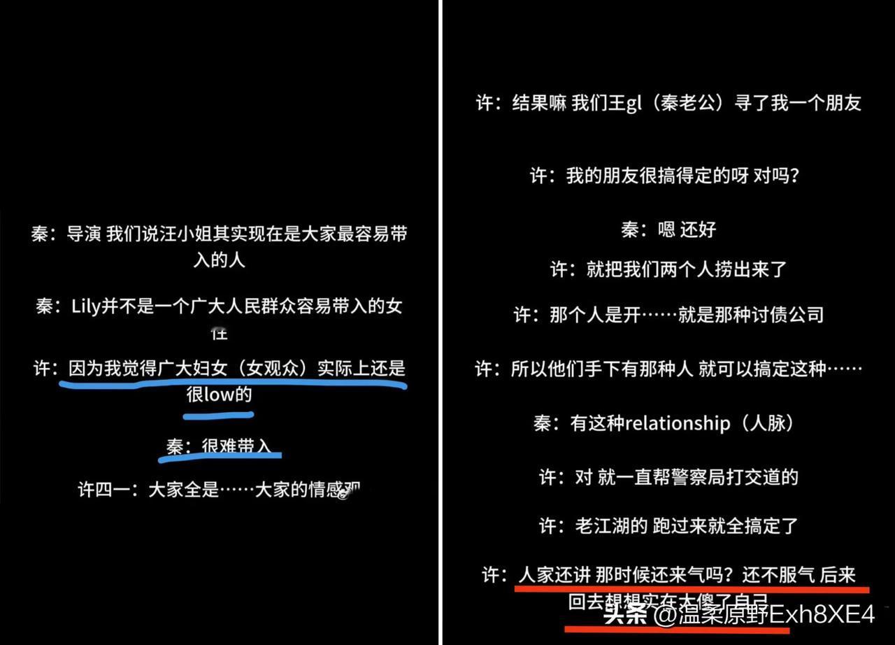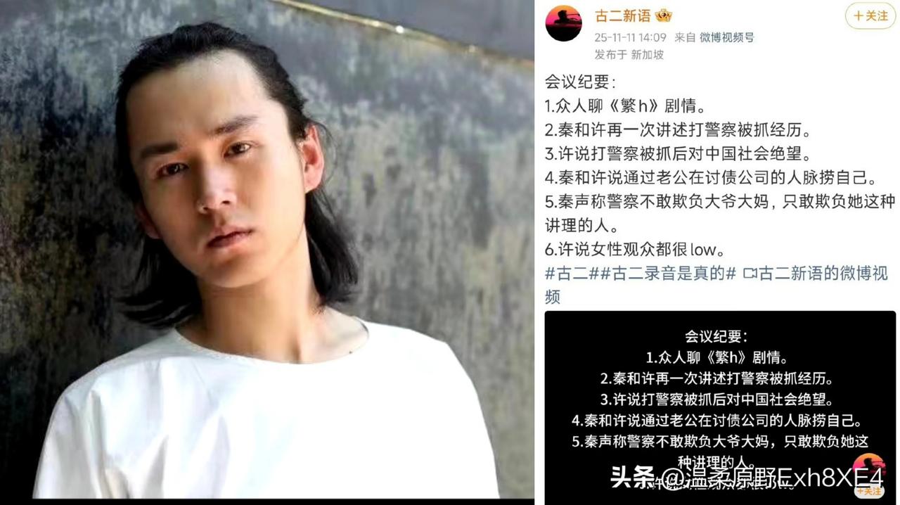 在警方通报秦雯自称袭警捞人后,编剧古二又放出录音,细节满满,让人直呼“牛”气!重点: 1,许说打警察被抓后对中国社会绝望(在处理纠纷时从后面拍人警察后背) 2,秦和许说通过老公在讨债公司的人脉捞自己(秦说自己破相了,老公还去把警察骂了一顿;更甚至,还说王gl看到自己那个样子,也准备上了(打警察)。不愧为编剧,真能吹) 3,秦声称警察不敢欺负大爷大妈,只敢欺负她这种讲理的人(蛮不讲理的双标人吗?) 特意看了下古二的地址是在新加坡,怪不得他们去给人家国内的外婆发律师函。古二据说现在已经用上眼球仪了,可能是没有后路的人,才会做出这些鱼死网破的举动吧! 有网友说,最可怕的是这个圈子有多少古二、秦雯、王家卫? 您怎么看呢?