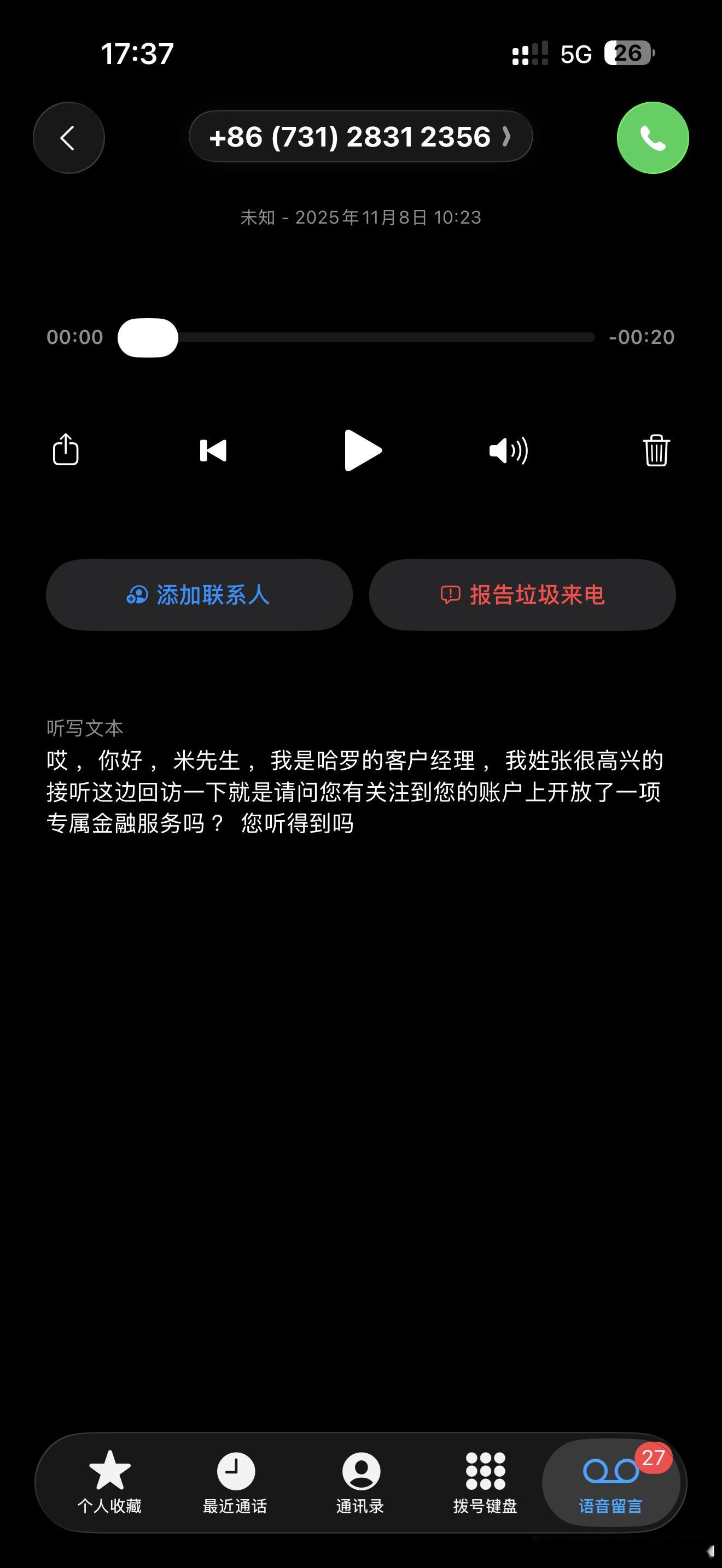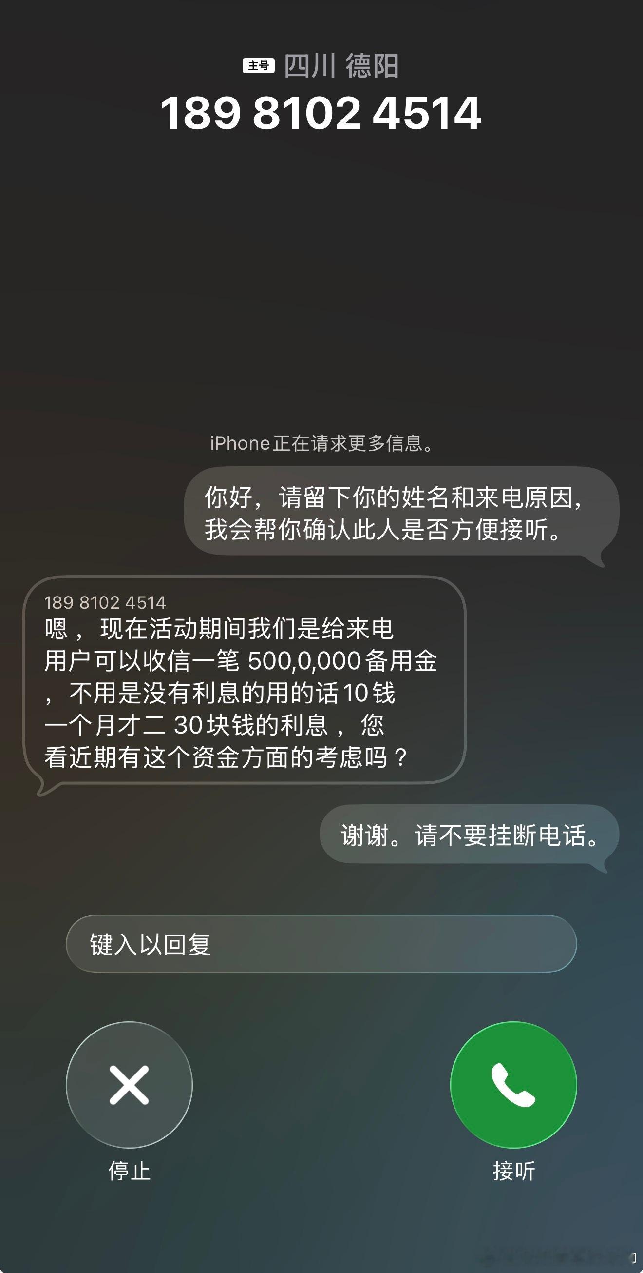 iPhone的未知来电筛选功能真的很好用,遇到未知来电会语音询问来意,然后生成文字,这样真的可以过滤每天很多的广告垃圾电话!尤其是这个哈罗共享单车,真的很垃圾,每次骑完车第二天总会接到哈罗单车贷款的广告!!!