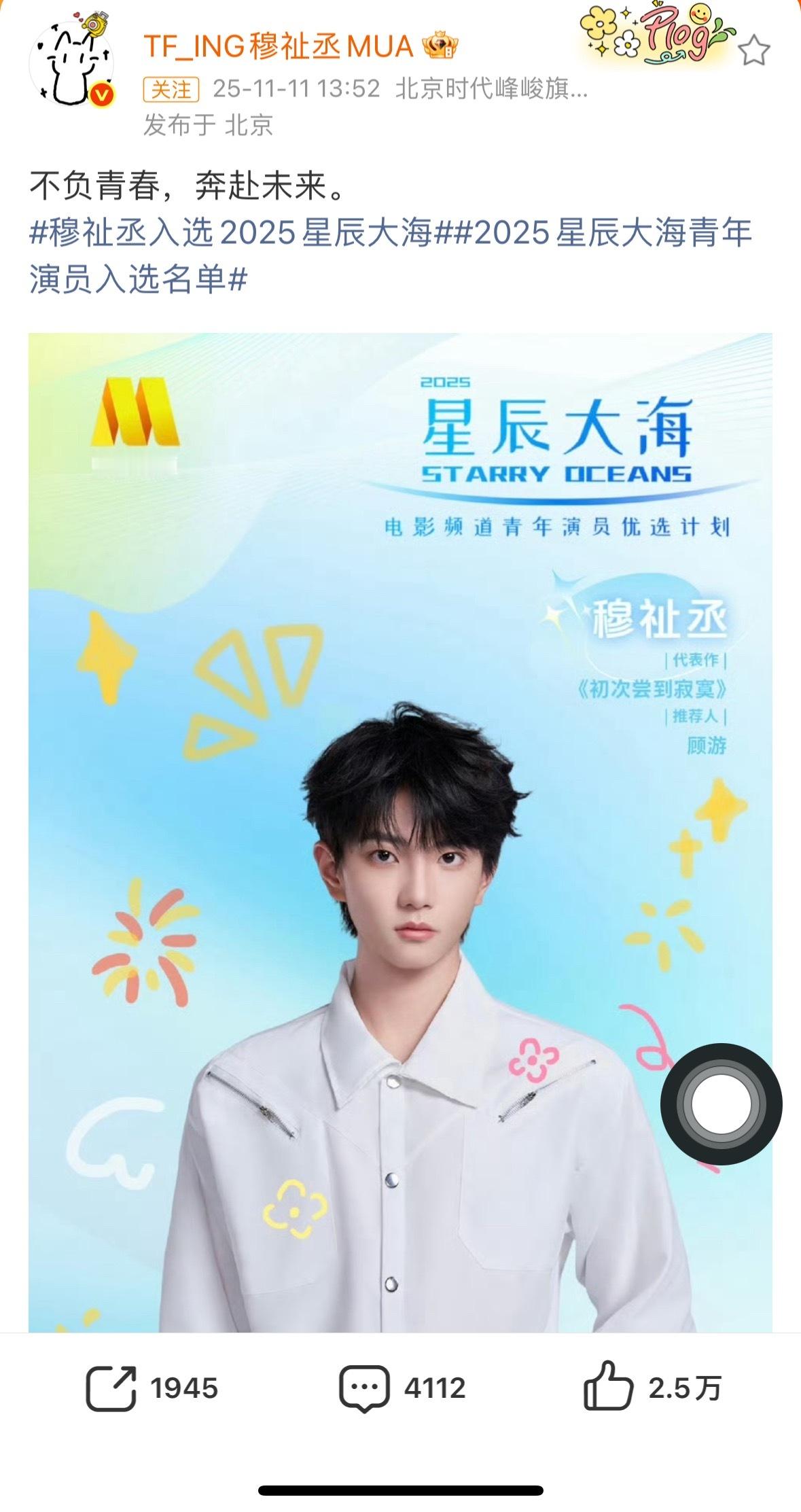 恭喜穆祉丞入选2025电影频道星辰大海青年演员优选计划!🎉期待与穆祉丞共同描绘未来的‘星辰大海’!