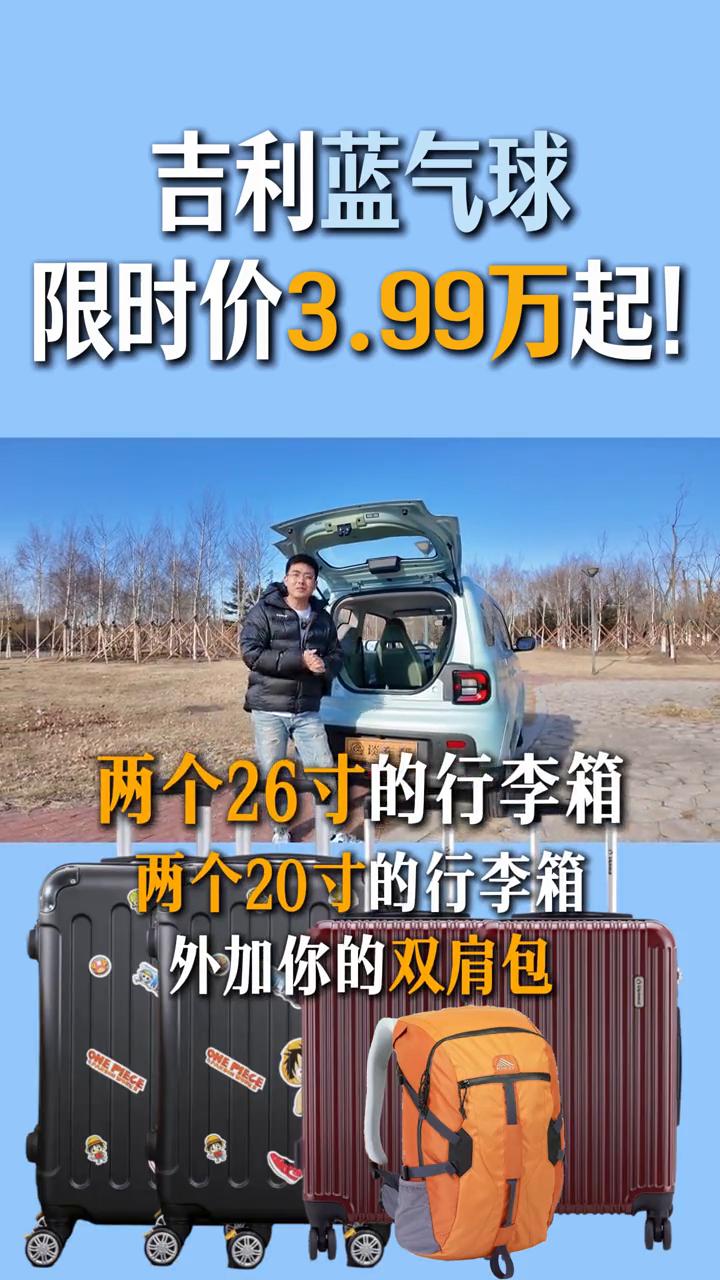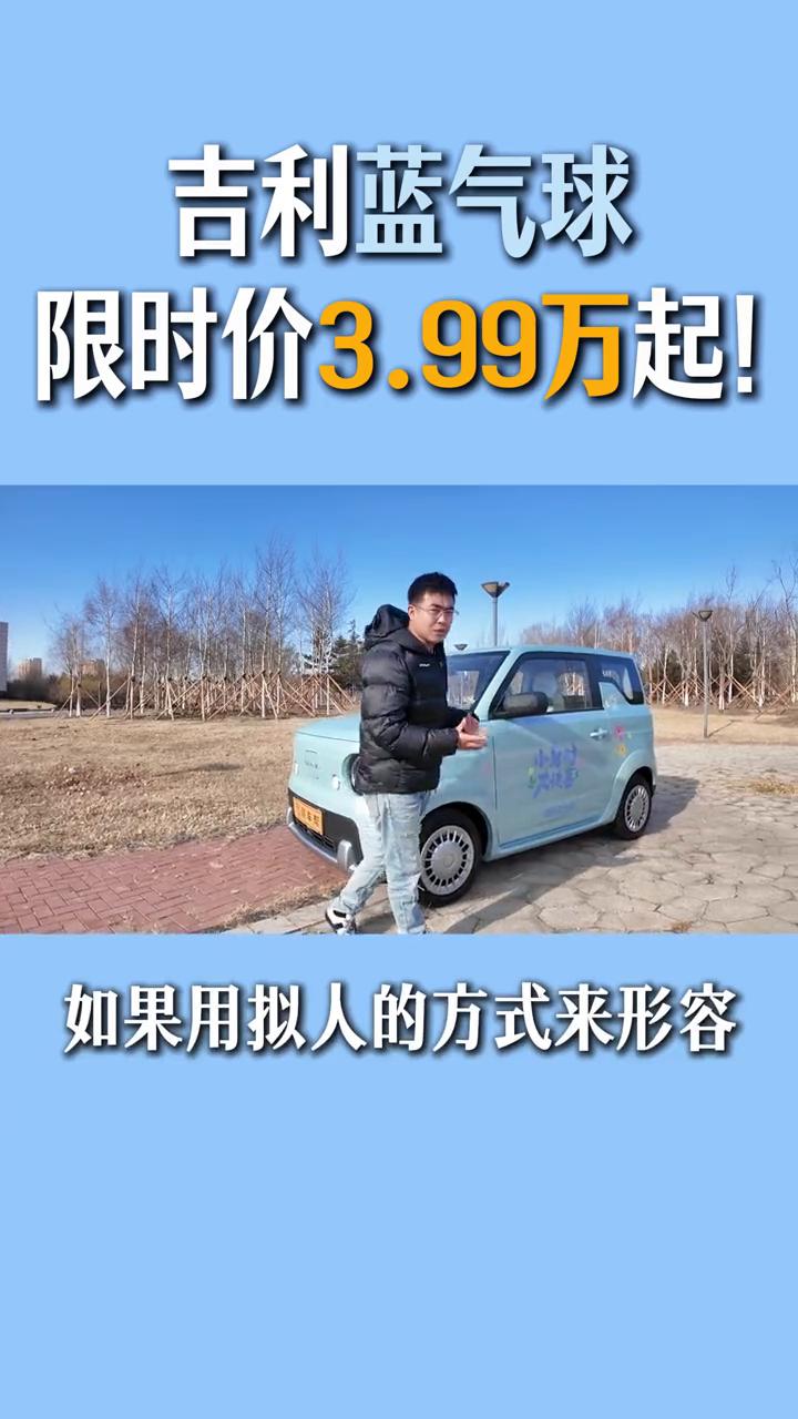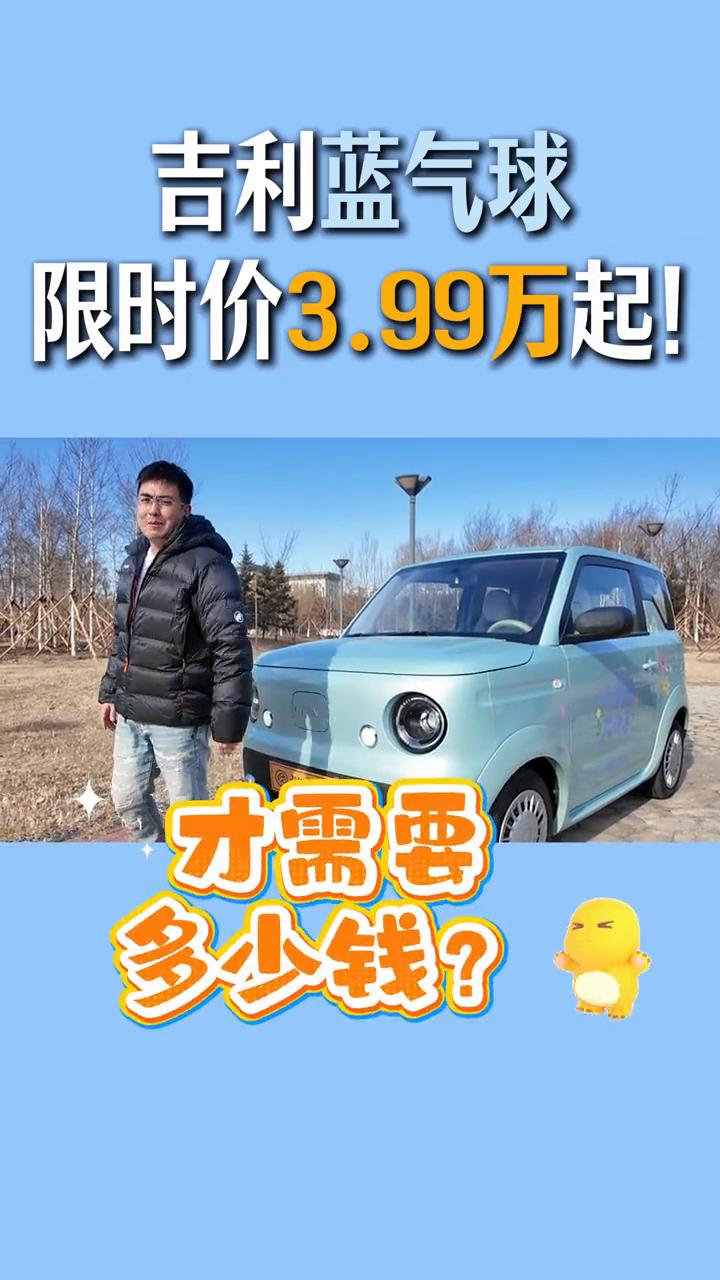 "都市小精灵"微电新优先,限时价3.99万起!闭眼冲!吉利蓝气球。 兄弟们,今天带你们体验一台特别适合城市代步的小可爱,吉利蓝气球。先说一下最打动我的点,价格。吉利蓝气球金秋限时钜惠,3.99万元起,同时限时价还可以叠加至2万元日补。数学好的你们算一算,它落地才需要多少钱? 作为一款新进的纯电小车,颜值还是很在线的。两个圆圆的大眼睛,看着很萌很可爱。车身的颜色也是非常的丰富,大海蓝、蜜桃粉、小草绿等等多种颜色可以选择,开着它上街回头率肯定会很高。 接下来看看它的身材,3米1的车长,轴距却达到了2015mm。什么概念?如果用拟人的方式来形容,它就是脖子以下全是腿。所以它的内部空间真的是同级别领先的水平了,比长安lumin、奔腾小马、QQ冰淇凌的轴距都要长。2+2的四座布局,后排坐两个成年人也是完全没有问题的,不是那种"假四座"。 而且全车共有11处的储物格,就连仪表台的上方都安排了一个,甚至这里边还有一个小挂钩。看到这你是不是也想打包一碗麻辣烫了?后排座椅放倒之后,容积直接干到了800L。什么概念?可以轻松的放下两个26寸的行李箱,两个20寸的行李箱,外加双肩包。 怎么样这个身材你喜欢吗?开起来怎么样?真的是特别的轻巧灵活。最大功率30千瓦,最大扭矩是110N.m,比宏光MINI高配车型青春版还要强。城市里超个车/变个道是完全不费劲。而且它还有正常和运动两种模式,以及三档的动能回收,最高100公里的时速,开起来也不单调。210公里的纯电续航也是同级别当中的翘楚了。更为重要的是它还配备了22kW的直流快充,半个小时就可以从30%充到80%,这个补能速度绝对是同级别当中的扛把子了。 安全方面也完全不用担心,吉利蓝气球采用的是高强度的笼式车身,同级唯一的激光焊接车顶,前排还配备了双安全气囊,电池包还经受住了火烧、挤压、泡水等50多项安全测试,智能电池热管理系统也可以实时监控电池状态。 说实话,限时价3.99万元起的吉利蓝气球真的是微电里边价值的新王者了,想买台城市代步神器,它就闭眼冲吧!