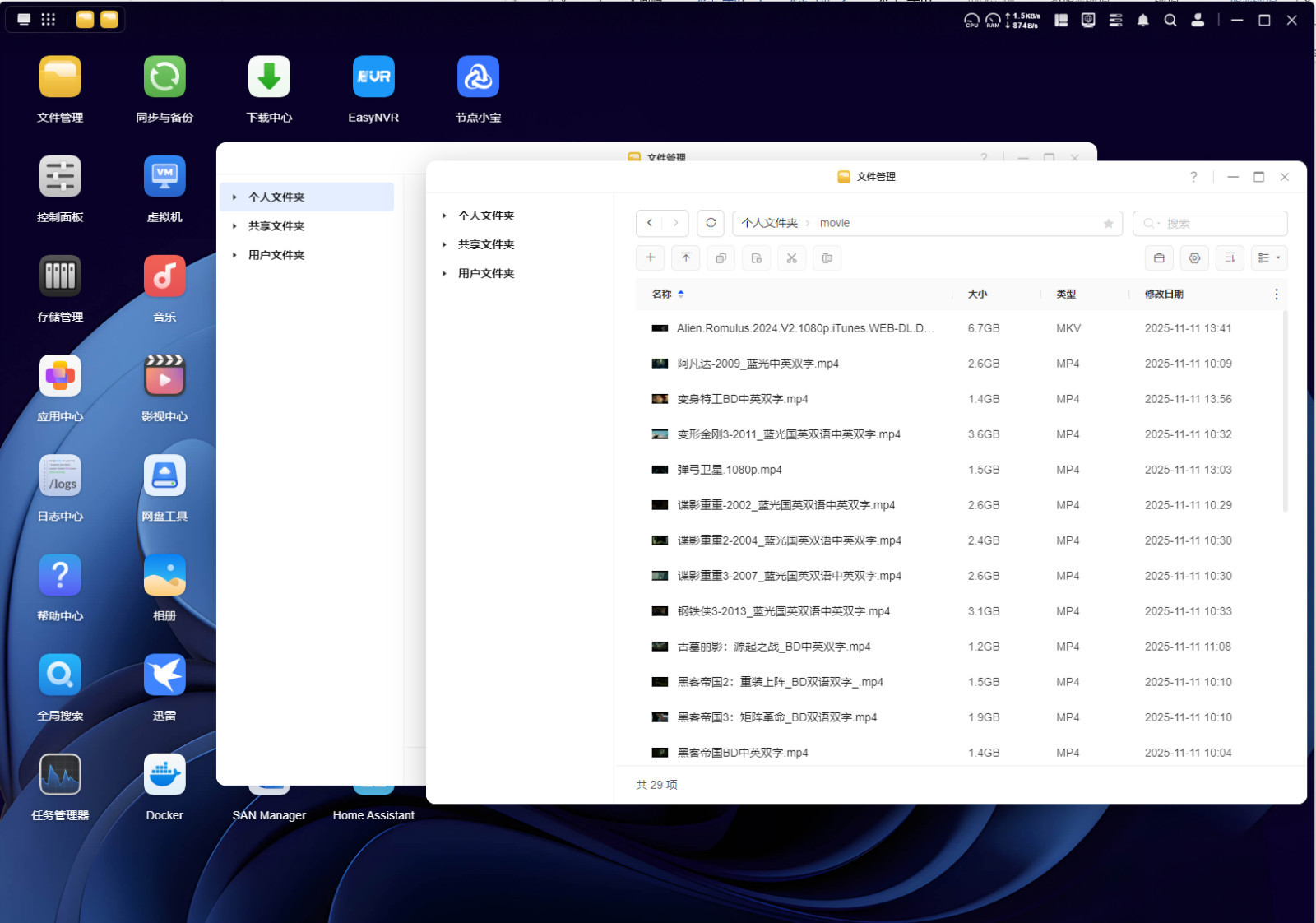说到NAS,很多用户的印象就是大号存储工具。事实上,大容量存储只是NAS最基础的功能之一,听音乐、看电影,做智能相册,还能当高性能的路由器使用,我家的绿联DXP4800 Plus就是万能小助手。说白了,要想把NAS具备各种功能,硬件配置必须要强,不然根本玩不动。绿联DXP4800 Plus搭载英特尔8505处理器,拥有16GB DDR5双通道内存,128G的SSD系统盘,1个2.5G网口,1个万兆网口,还有SD卡插槽、HDMI接口,多个A口和C口等等,这价格、这配置相当能打!这台NAS可以装4块机械硬盘。内置2个M.2插槽,最高支持136T存储,完全可以满足3口或4口之家的使用。现在已经成为我的私人存储服务器。NAS里的影视中心是非常实用的功能,现在各大视频平台的热播剧都需要买VIP会员才能观看,有了绿联DXP4800 Plus后,可以搭建属于自己的家庭影院。迅雷可以下载自己喜欢的大片和热播剧,然后系统会自动生成海报封面、演员信息等等。平时遇到喜欢的电影大片,或者是电视剧,直接把下载地址复制到迅雷、qB或者下载中心等功能里面下载,下载完成后,把影视专用目录关联到影视中心的媒体库,电视、平板、电脑直接安装绿联云就可以直接同步观看了。如果家中的电视比较老,可以通过NAS上的HDMI接口来连接,或者直接DLNA投屏播放NAS里的大片或热播剧,多种方式,总有一种适合你。相信很多人都知道,数据备份是NAS标配的功能。不同的是,绿联NAS不仅可以备份手机中的照片,还可以备份多个设备的文件,甚至是我安卓手机上的微信文件,这个功能非常实用。比如,微信群里或朋友发过来的图片,过段时间可能就无法查看,因为微信App会自动清理照片或文件。在手机端安装绿联云App后,先把微信中的文件、照片和视频保存在手机上,然后绿联NAS会自动备份微信中下载的文件,或者是图片和视频。另外,绿联NAS还支持Docker和虚拟机,非常适合一些喜欢探索各种玩法的玩家。我在NAS中安装了虚拟机,导入了爱快软路由固件就变身一台高性能路由器,充分利用了DXP4800 Plus的万兆网口和处理器性能,省去了购买昂贵硬路由的费用。装爱快也非常简单,先在应用中心安装虚拟机,然后导入爱快IOS镜像,再创建虚拟机网络时,分别将网络映射到宿主机网卡上,再进入爱快系统进行路由设置就可以了。除了安装软路由器外,也可以变身SQL服务器。众所周知,很多财务软件,或者是收银软件都需要SQL服务器,专门部署一台服务器太贵,还需要定期备份数据,成本非常高。以朋友家的超市来说,SQL服务器和收银服务器在一台电脑上,系统又卡又慢,数据容易丢。有了绿联DXP4800 Plus后,可以通过虚拟机或者Docker,把SQL服务器部署在NAS设备上,这样既能保证数据安全,还可以定期备份收银机的数据。我家有多台NAS设备,最好用的还是这台DXP4800 Plus,操作简单容易上手,非常适合我这样的小白。流畅的UGOS Pro系统,丰富的插件,系统专业度也很高,可以让NAS变成家庭万能小助手。