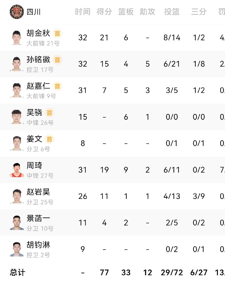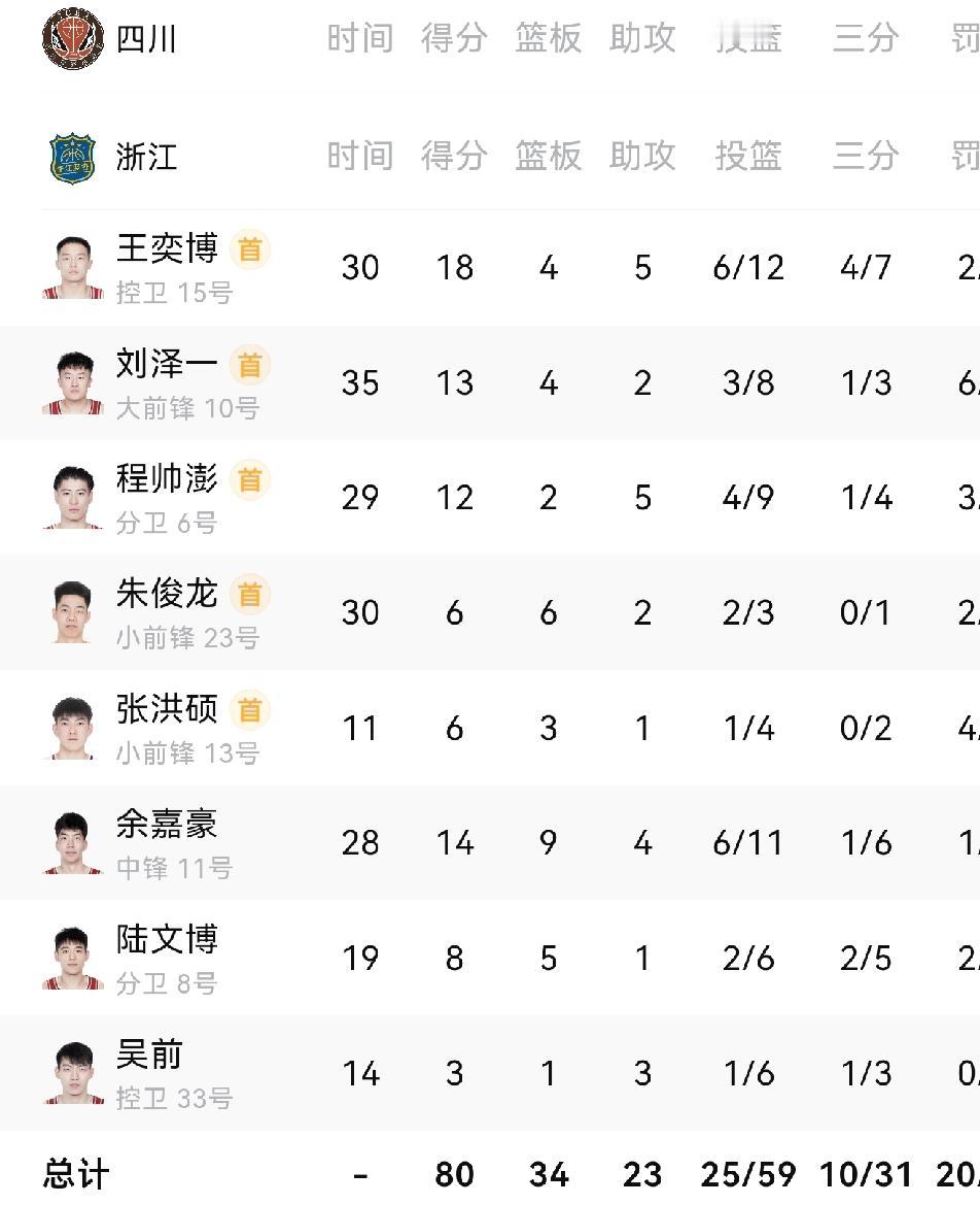 广厦的是卧底吧!真是惊掉下巴!拥有周琦、胡金秋、孙铭徽等球员的四川男篮,居然被吴前、刘泽一、程帅澎的浙江队淘汰,无缘决赛! 这场比赛,浙江队敢打敢拼,一扫此前负于广东队的颓势,很好的限制了周琦和胡金秋,最终以80-77淘汰对手,率先进入决赛,静待广东与辽宁的胜者! 看出手与得分,谁在潜水,谁在裸泳? 四川男篮 浙江男篮