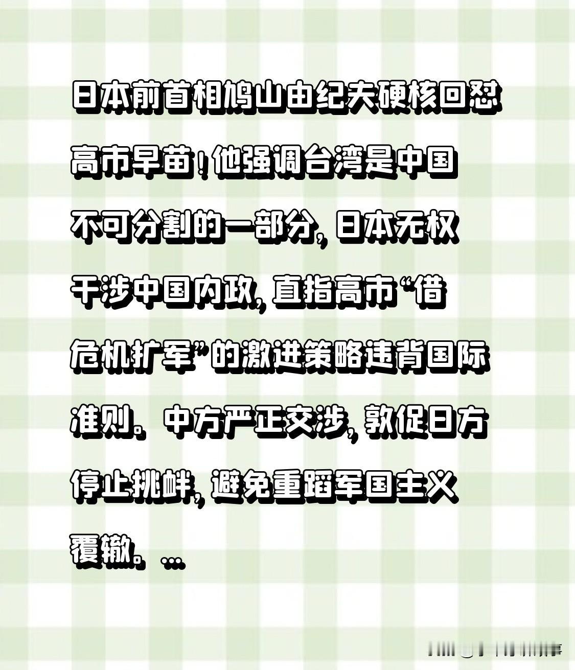 日本前首相鸠山由纪夫硬核回怼高市早苗!他强调台湾是中国不可分割的一部分,日本无权干涉中国内政,直指高市“借危机扩军”的激进策略违背国际准则。中方严正交涉,敦促日方停止挑衅,避免重蹈军国主义覆辙。高市言论被批“越界三重罪”:违反日本“专守防卫”原则、挑战战后国际秩序、加剧台海紧张。历史教训犹在,日本右翼若执意玩火,终将引火自焚!
