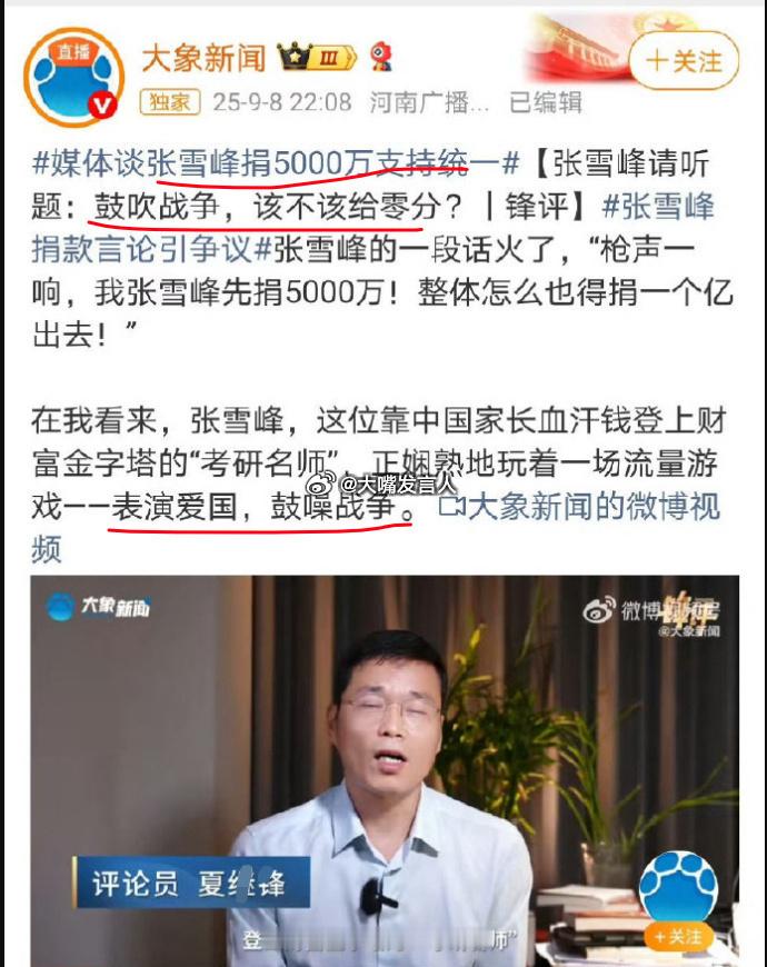 看看今天的两条热门话题, ,,金政委多次提到过,坚持解决湾湾问题两种手段,和统、武统都要坚持。大家想想前段时间,张雪峰开心于将来的国家统一,说要为统一捐款,引来国内少数媒体跳脚骂街,给张扣上“鼓噪战争”的帽子(图8),那金灿荣、张维为也多次谈过统一、也谈过武统,这些媒体怎么不敢给金张扣帽子呢?这些媒体还不是G眼看人低,不敢欺负身后有组织的人吗?