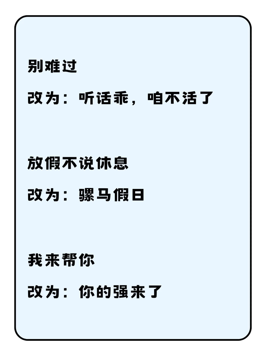 当代年轻人嘴替来了!“别难过”变“听话乖咱不活了”,“放假不说休息”成“骡马假日”,“我来帮你”是“你的强来了”,那些被玩坏的梗你跟上了几个?