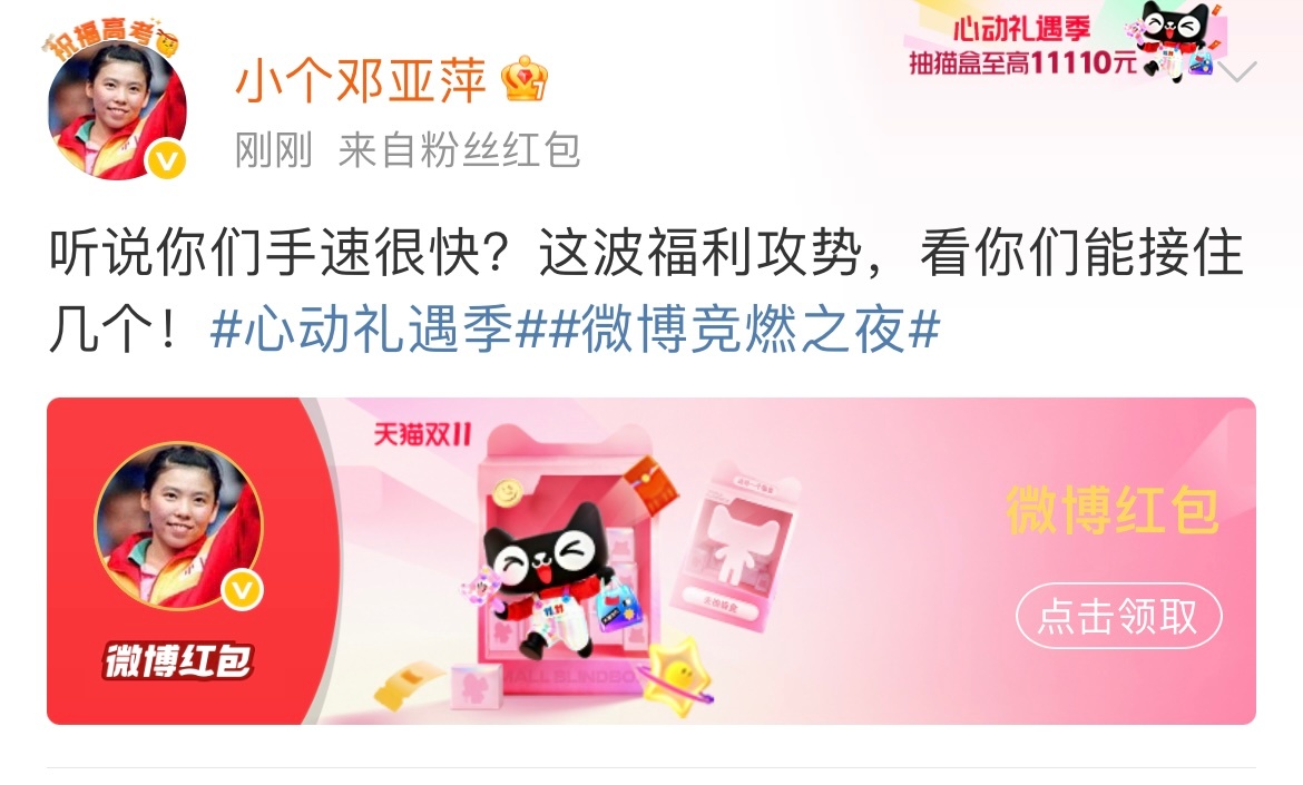双11心动礼遇季直接把体育圈半壁江山请来发福利了!郎平带着“铁榔头”暴击红包,一出手就是稳准狠的福利;赵丽娜门将级守护,把好运牢牢守住送你;吴敏霞跳水式撒钱,红包额度直接“入水即巅峰”;邓亚萍乒乓快攻式送礼,福利来得又快又猛!奥运冠军、世界冠军亲自站台,红包额度加量又加码,抽中概率超高,还有超萌猫盒可以集,实用好物拿到手软。不用复杂操作,简单几步就能参与,既能为喜欢的运动员打call,又能薅到实打实的福利,这波血赚不亏!别犹豫啦,赶紧冲去参与抽红包、集猫盒,把冠军同款好运和福利一起带回家~
