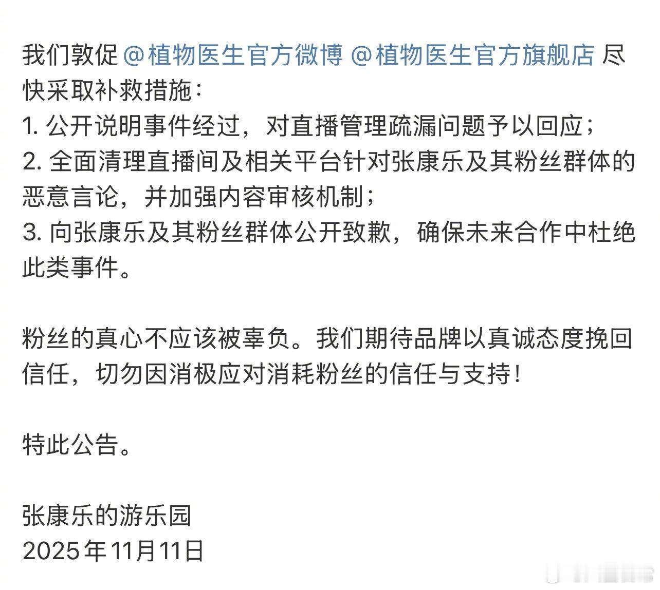 张康乐粉丝向植物医生维权,并表示将停止对植物医生品牌的一切支持活动