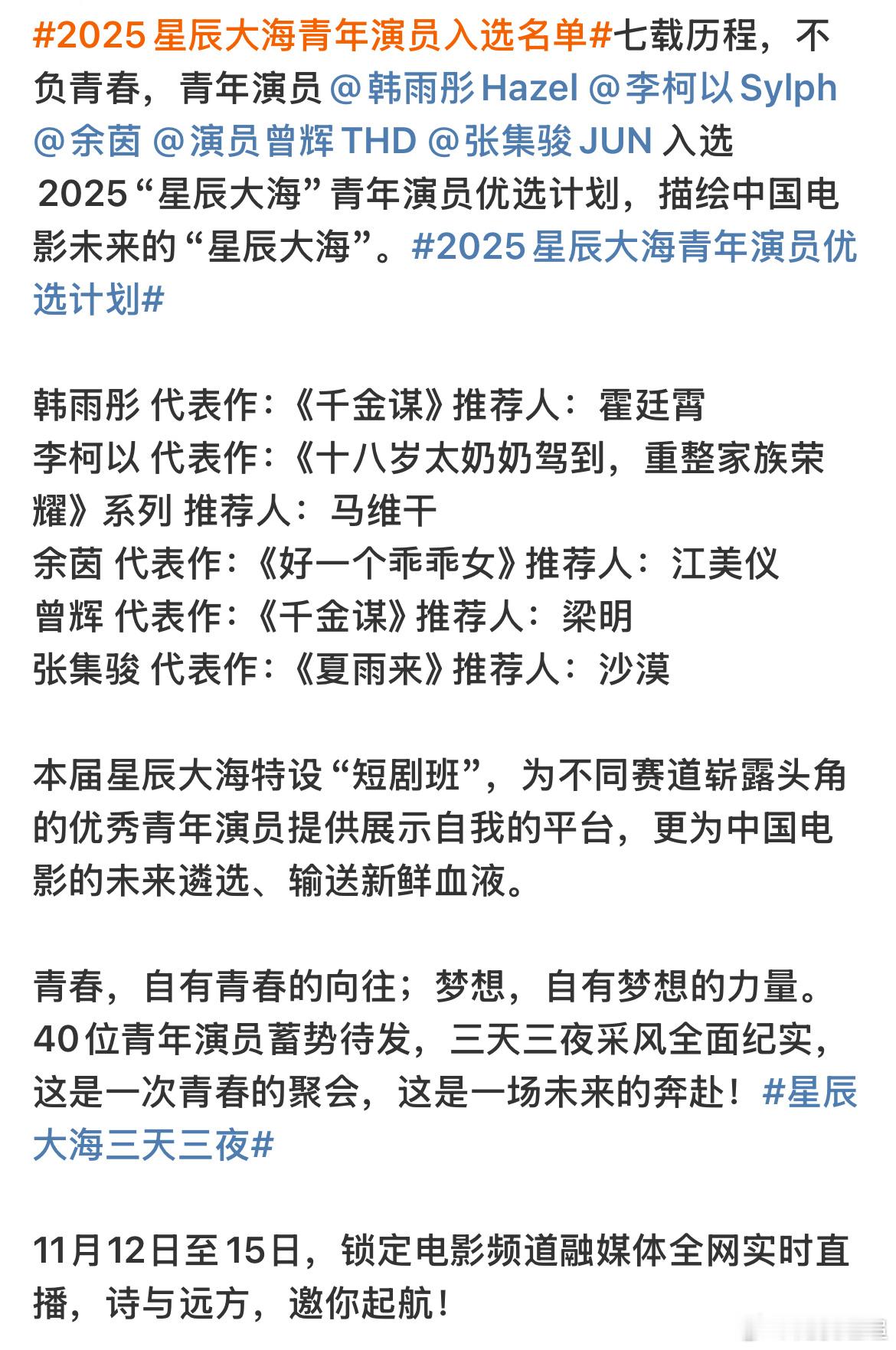 2025星辰大海青年演员入选名单!短国也是好起来了! 今年特设了短剧班! 韩雨彤 李柯以 余茵 曾辉 张集骏!
