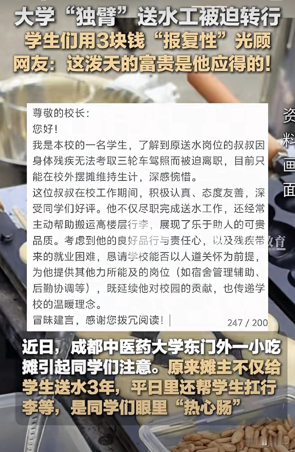 “独臂”送水工转身摆摊,大学生用“3元账单”狂涌报恩!这才是真正的“双向奔赴”!3元一串的善良,在大学门口沸腾! 近日,成都中医药大学东门外的一个小吃摊,被大学生们团宠。 原来摊主是给大学生们送水三年的送水工,平常还经常帮学生们扛行李,在学生们眼里是个不折不扣的“热心肠大叔”! 只是很不幸,大叔意外残疾成了“独臂大侠”,无奈只能放弃送水工的工作,转而在学校门口摆小摊做生意,来维持生计。 当有人认出他以后,就在学校的内网发布了信息,知恩图报又心思纯良的孩子们就不约而同的开始了“报复性”消费,用一次次3元的账单回报着曾为他们负重的人。 甚至有学生写信给校长,恳请学校可以出于人文关怀,为他提供一个他力所能及的工作。 而大叔始终用3元的物超所值来回应着孩子们。 网友们纷纷点赞这波双向奔赴的爱: “学生们再次和工农群众站到了一起 !” “大哥的善良,被孩子们所记住;孩子们的善良,在温暖着大哥!双向奔赴的爱,让这个冬天特别的温暖!” “人都是相互的。” “好像记得当年的淄博烧烤也是大学生给宣传带火的!” “双向奔赴!” “这是善良的价值!” “3块钱真的值,别处都要十块钱一串!” “孩子们的善良具象化了!” “当代的学生励志向上、善良可爱的的也很多!” 还有已经毕业的学生发出感叹,“叔叔真的做什么都做得好!几年前我读大学的时候住的那栋寝室没有电梯,都是叔叔自己扛上来的,别的送水工都是放在门口就行了,他真的会帮我们换好,我们要帮忙他喊让我们让开莫砸到各人了,他得行!” 这样善良的人,值得孩子们用汹涌的账单来回报,就像网友所说:这泼天的富贵是他应得的! 这不仅仅是一个小吃摊的火爆,更是一场关于善良与感恩的“双向奔赴”,是当下中国最动人的风景。 看,这就是我们中国的年轻人!他们或许偶尔自嘲“躺平”,但骨子里始终流淌着“滴水之恩,涌泉相报”的古老道义。 从淄博烧烤到成都小吃摊,一次次证明,励志向上、善良可爱的年轻人,永远是这个世界的光。 愿每一份默默付出的善意,都能被看见,被回报,迎来它应有的“泼天富贵”! 带定位晒今日生活 我的今日状态:😁轻松愉快 我这里的天气:☀️晴天
