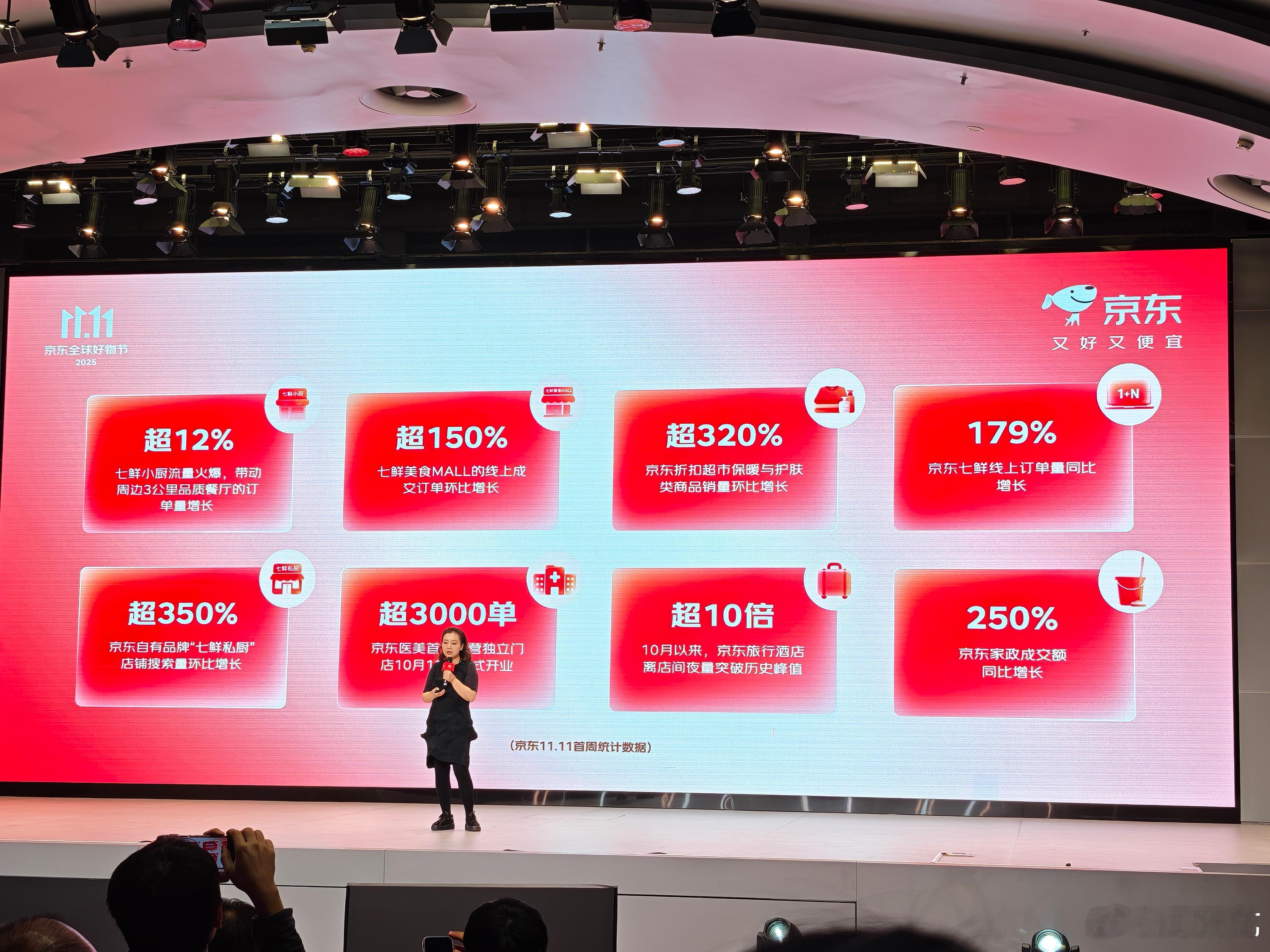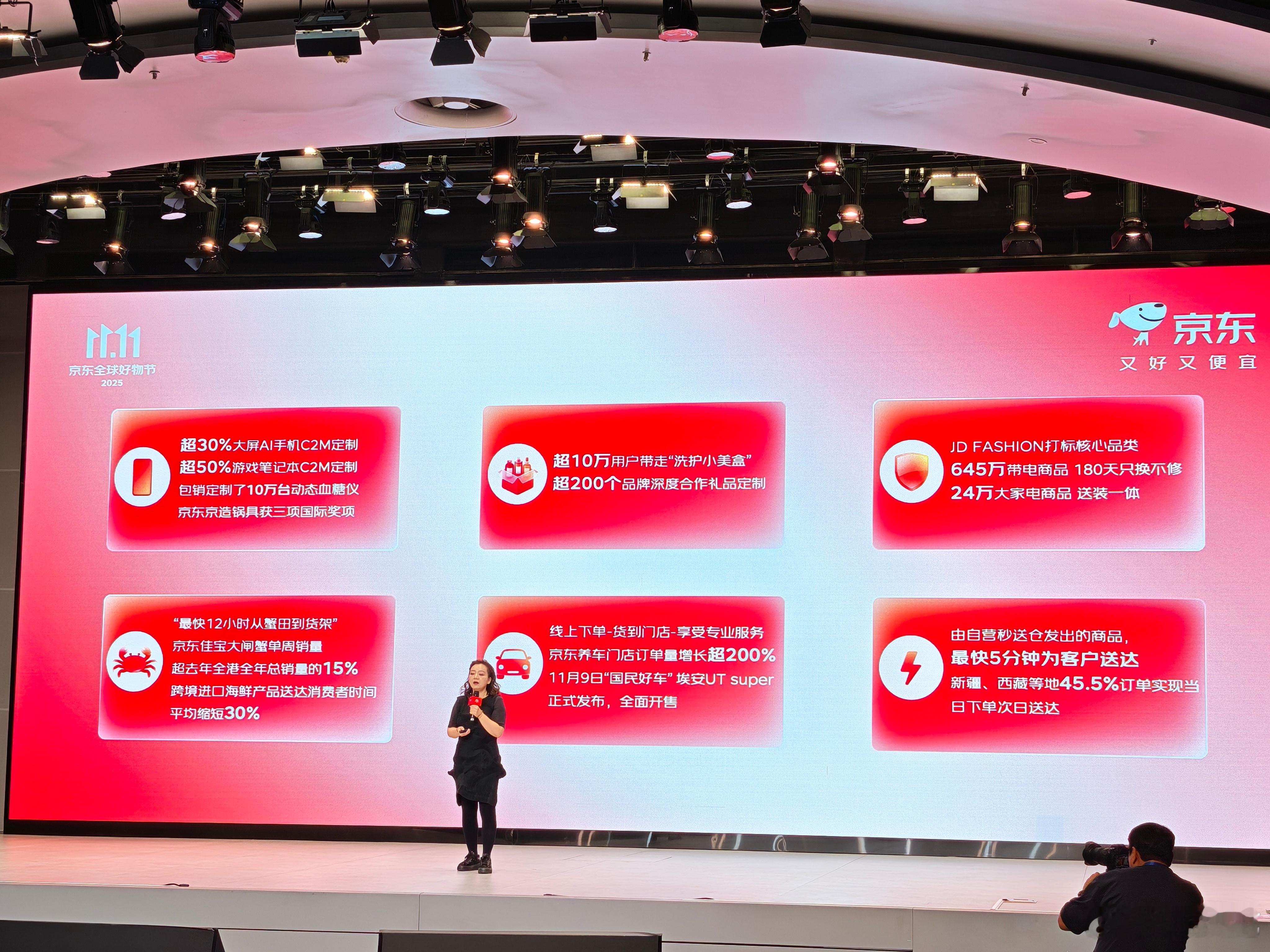 在2025年京东11.11媒体开放日活动上,京东展示了其“超级供应链”在大促中的强大应用。活动现场的大屏幕呈现了丰富的成果数据:京东AI手机和游戏笔记本的C2M定制占比分别超过30%和50%,更有10万台动态血糖仪通过包销定制推向市场;洗护小美盒受到超10万用户青睐,200多个品牌参与深度合作;JD FASHION打造的核心品类中,645万件带电商品享受180天只换不修服务,24万件大家电实现送装一体。供应链效率同样亮眼:京东佳宝大闸蟹从蟹田到货架最快仅需12小时,单周销量超过去年全港全年总销量的15%;跨境进口海鲜的送达时间平均缩短30%。京东养车门店订单量增长超200%,安UT super“国民好车”也在11月9日正式发布开售。物流速度再创新高,自营秒送仓发出的商品最快5分钟送达,新疆、西藏等地45.5%的订单实现当日下单次日送达。本地生活与服务领域同样表现强劲:七鲜小厨带动周边3公里品质餐厅订单增长超12%,美食MALL线上成交订单环比增长超150%;京东折扣超市的保暖与护肤类商品销量环比激增320%;七鲜线上订单量同比增长179%,自有品牌“七鲜私厨”店铺搜索量环比飙升350%。京东医美首店单日订单超3000单,旅行酒店离店间夜量10月以来突破历史峰值,家政成交额同比增长250%。一系列数据充分展现了京东在供应链、物流、商品定制与本地生活服务等多方面的综合实力,为消费者带来了“又好又便宜”的购物体验。
