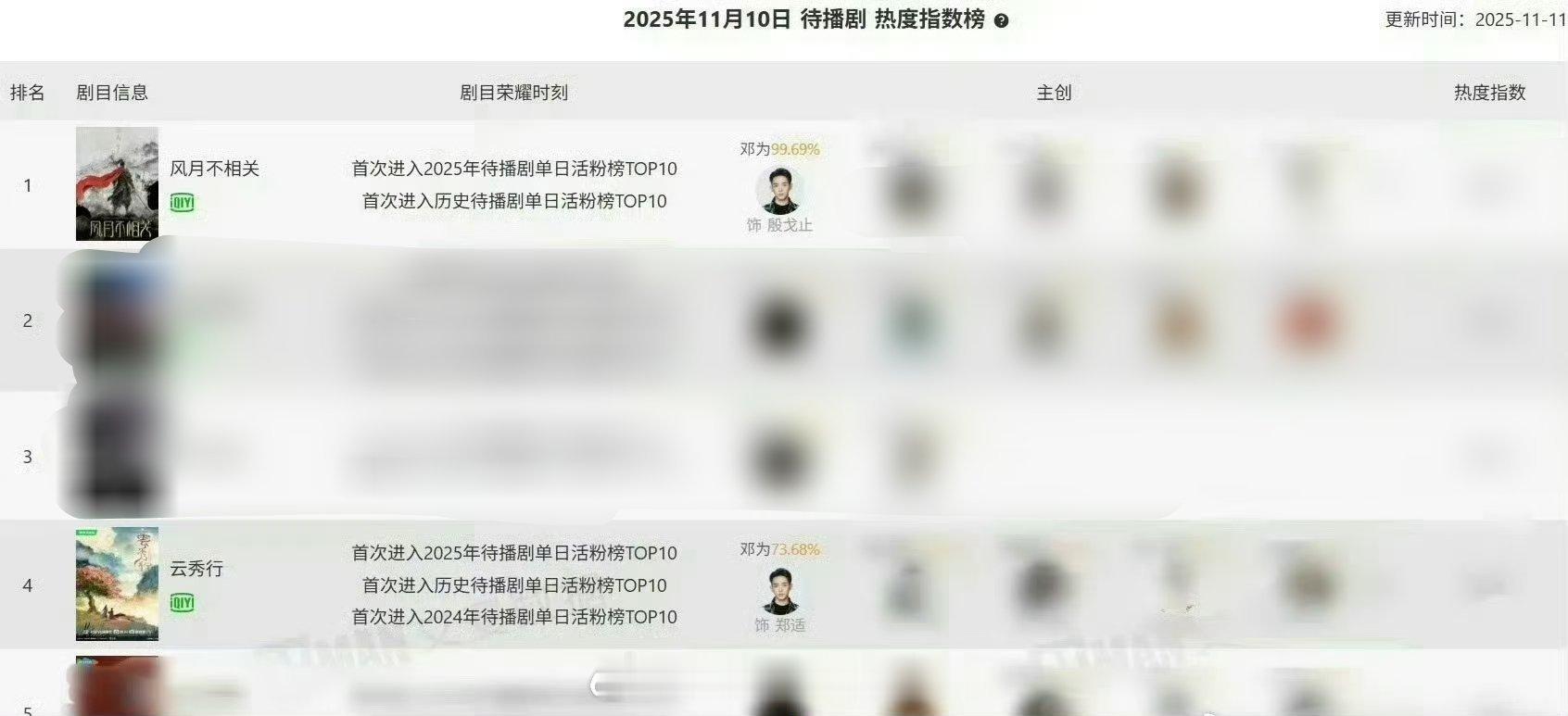 邓为风月不相关是待播剧热度榜TOP1!邓为热度贡献值99.69%,纯单抗!有为子云秀行也进入待播热度榜单的第四名了,邓为郑适的热度贡献值占全剧演员73.68%!顶流就是顶流,为子无论在哪里都是中心。