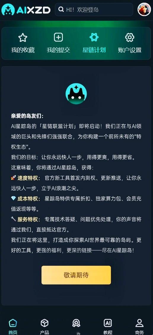 计划推进的很顺利,在aixzd.com的专属特权就要来啦 咱们AI星踪岛的星链计划,是给登录用户的福利,我们会送给岛上的朋友们,各种兑换卡和码