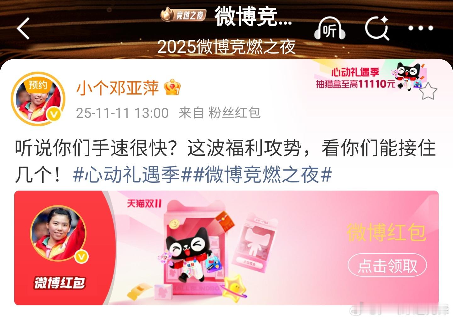 听说有人想比手速?当年,邓亚萍在赛场上以速度和犀利著称,年轻人能接住她的发球吗?不要担心,这次不是比乒乓球,是天猫双11心动暴击!拼网速、比点击,准备好你的神仙手速,面对如此犀利的福利攻势,看你能接住几个!