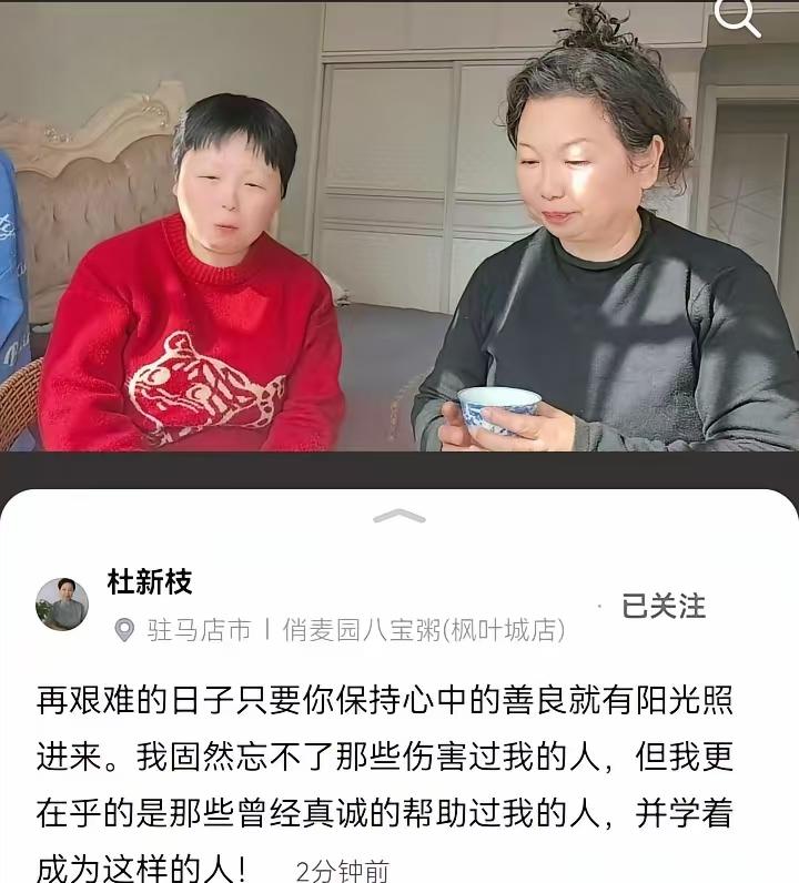 杜妈又发视频了,她和女儿举杯喝茶。不光是你一家,成千万万的家庭都和你一样,你是怎么知道有成千上万个孩子被错换。 缺啥就强调啥,最缺的就是善良,女婿去哪?不晒晒?这个视频不错,她一定会有人请她进去喝茶的。 黑红也是红,普通人家还天天网络上胡咧咧暗搓搓明晃晃。 这脸真嫩啊,美颜能让猪八戒它二姨变成王婆,今天的美颜开的好,比那天的剥大虾的照忽然年轻30岁。 老杜时不时的拉傻姑娘和已故yc出来遛遛,赚点流量,用她自己的话说,一个母亲爱自己的孩子不是很正常么?谈得上什么伟大善良? 伤害别人还不够吗?怎么会有脸说出口?千年万年出了这个奇葩。 君子欲讷于言,而敏于行。老杜一贯说好听的,不做人事。 三观正的人才支持善良不做作的人,不像卖假牛肉的就是不道歉不回应,不赔付,整个一个装聋作哑。