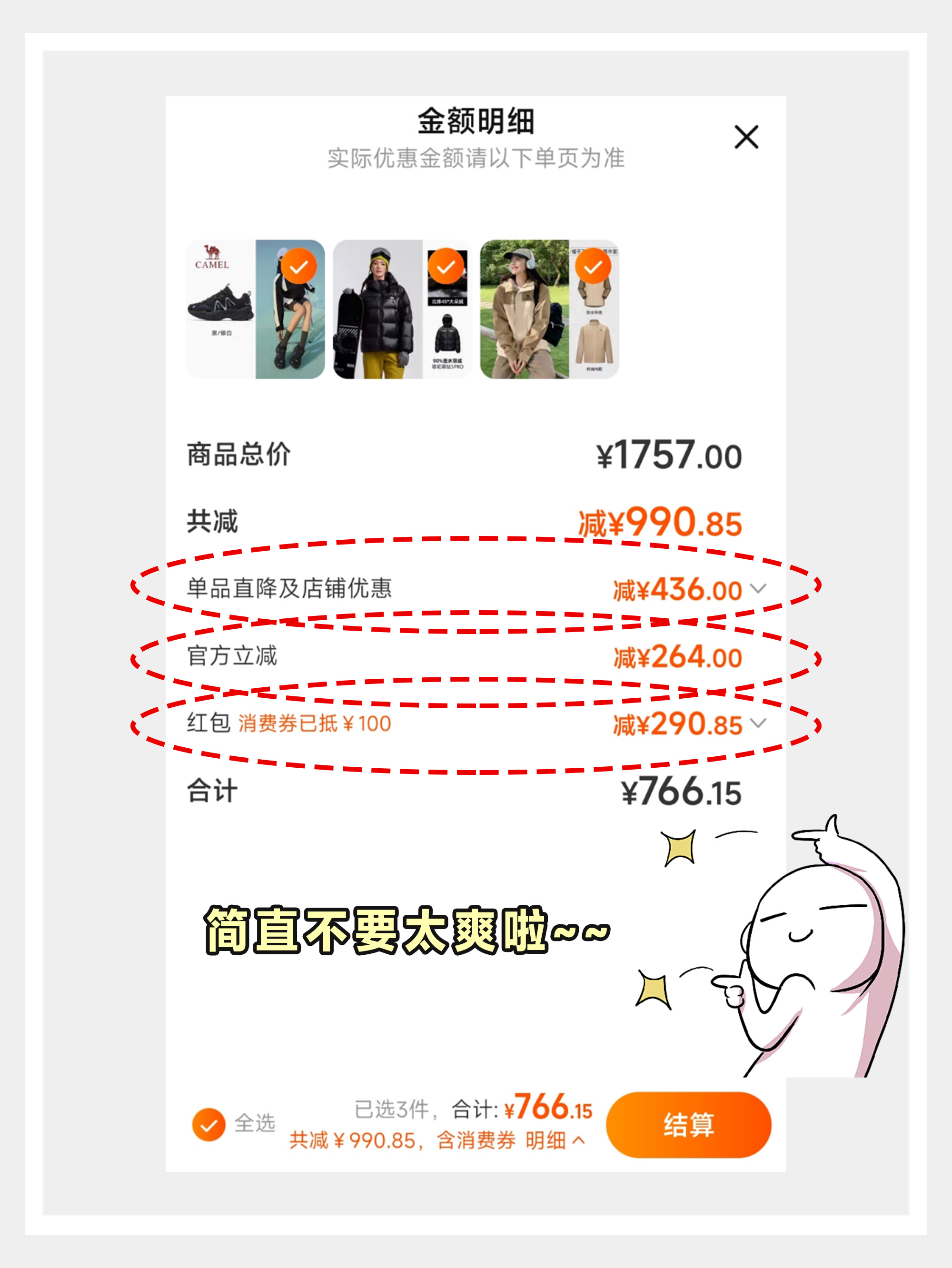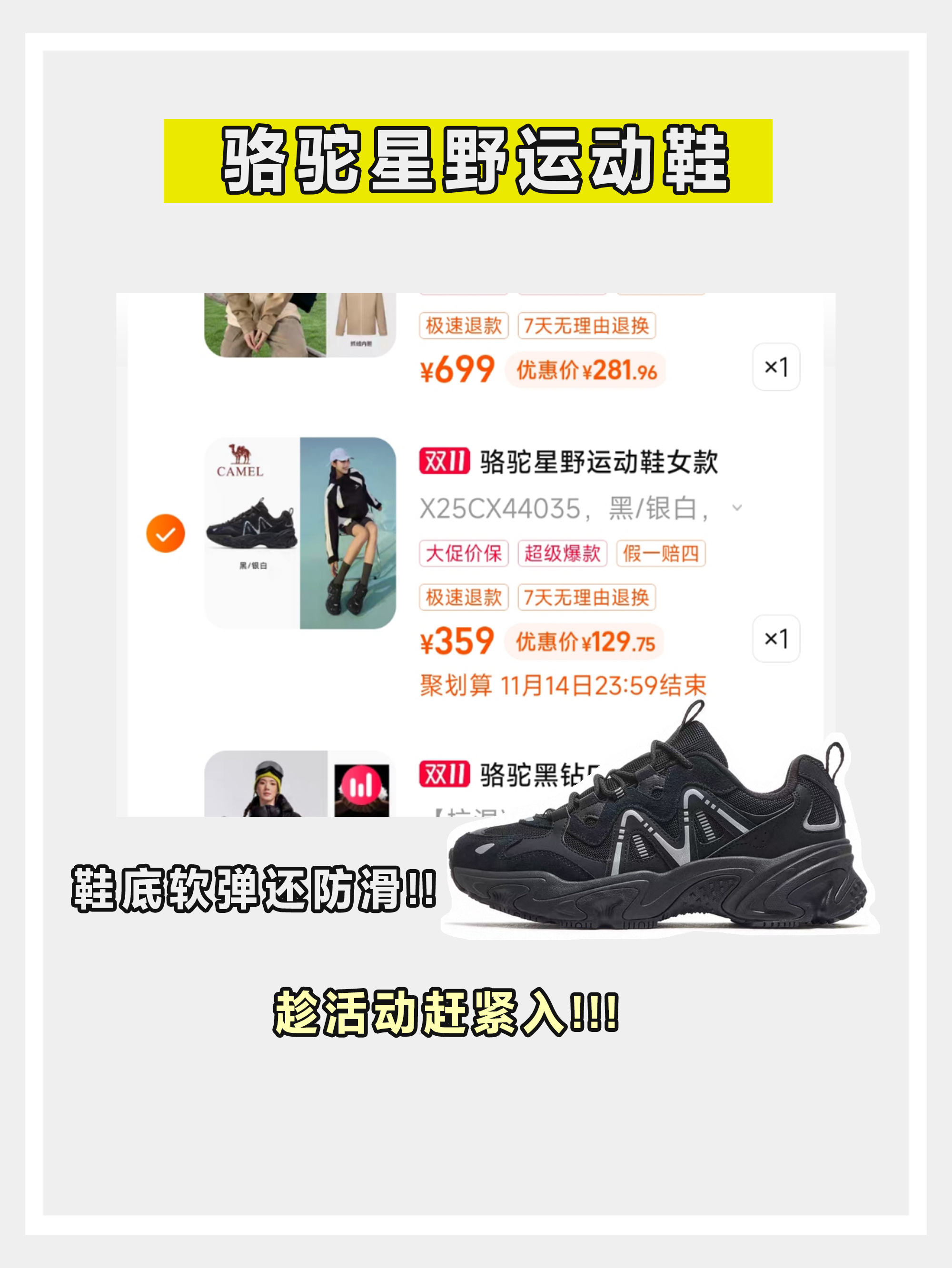 刷到双 11 要收尾的消息,才惊觉时间过得这么快!作为打工人,平时户外放松全靠装备撑场面,这次冲刺 24 小时必须冲 —— 叠加优惠 + 全年最低价,错过等一年! 先说说我盯了好久的骆驼三合一冲锋衣,防水硬壳 + 抓绒内胆,春秋单穿、冬天叠穿都绝绝子。防水保暖还能叠穿,去年买过同款的朋友都说防风又保暖,露营徒步穿它安全感拉满,这次不囤一件真的对不起自己。还有这双骆驼星野运动鞋,黑银配色巨百搭,平时运动、日常出街都能穿。鞋底软弹还防滑,我已经安利给好几个户外搭子了,趁最后 24 小时赶紧入。怕冷星人别错过骆驼黑钻 5PRO 户外羽绒服!90% 鹅绒填充,抗湿冷还保暖,北方零下十几度穿它都没问题。给爸妈也安排上了。以前总觉得双 11 买户外装备要抢预售,后来发现最后一波冲刺才是真福利,优惠力度没缩水还不用等预售发货。不管是回购多次的老装备,还是种草很久的户外新品,都能以年度最低价拿下。别犹豫了,户外人赶紧冲!