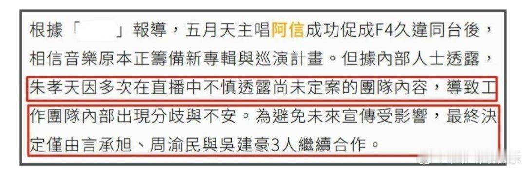 近日,据台媒爆料,“F4”组合原定将在今年年底举行的演唱会或将排除 ,由剩下的言承旭、周渝民、吴建豪三人改组为“F3”继续活动。对此,朱孝天方回应:“我们也不清楚什么情况”。至于朱孝天是否在准备这次演唱会,也表示“目前不方便透露”。有知情人透露,朱孝天之所以被踢出F4是因为他经常在直播中“无意间”泄露团体的工作安排,导致团队内部出现分歧和不安,为了避免未来宣传受到影响,所以就将他排除在外。