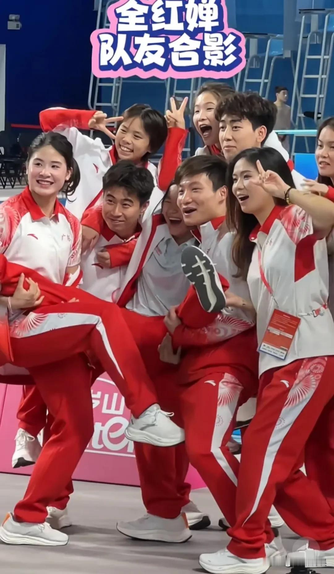 看到这张照片,我瞬间理解全红婵对记者说的那句“现在跳得很差,是我自己很快乐”这句话了! 在全运会跳水项目结束后,全红婵和队友合影,广东队的队友们把全红婵抬了起来,在镜头前比“耶”的手势,全红婵笑得眉开眼笑,乐开了怀。看得出来,她的队友都非常喜欢她,包容她。 其实,在她回到广东队养伤后,来自队友的鼓励和教练的关怀、排解,让走楼梯都很痛的婵宝得到了无限的信心。 她很快乐,是来自队友,来自亲人,来自教练,来自她内心对跳水的热爱,结果或许不是那么重要,她享受的是过程! 看看她这次全运会,尽管结果还有些不如意,但是她一直把笑挂在脸上,没有一丝阴霾,笑容灿烂,就像一颗火热的小太阳。她的快乐很纯粹,就是来自她心底对跳水无限的热爱。