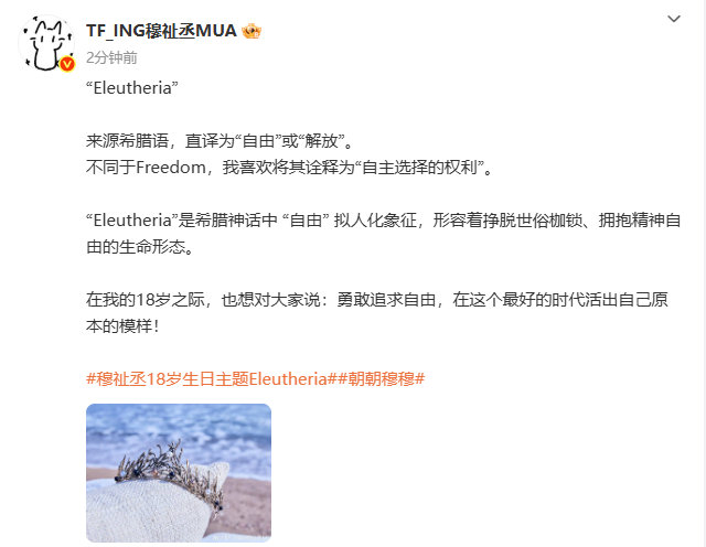 穆祉丞18岁生日主题来源希腊语,想对大家说勇敢追求自由!