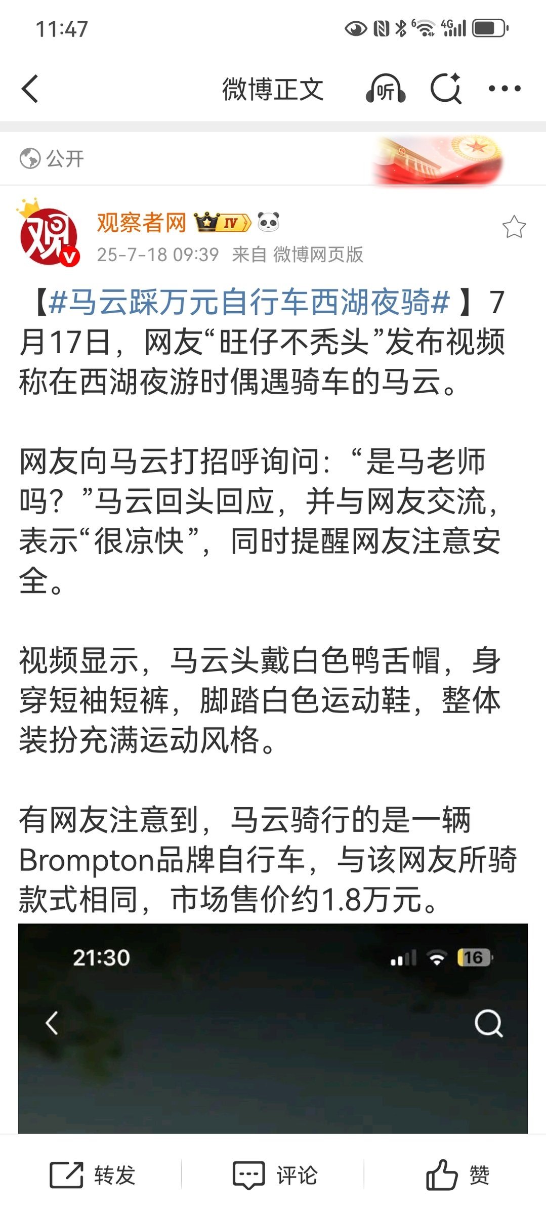 【】如今媒体越来越无聊,刻意强调马云骑"万元自行车"是既蠢又坏。对马云这样的企业家而言,1.8万元的自行车与其财富水平完全匹配,根本谈不上奢靡。真正值得关注的是他夜骑西湖的朴素生活方式和亲切的公众互动,而非消费品的价格标签。我曾经写过,上世纪八十年代、九十年代,我们芜湖市的“傻子瓜子”创始人年广九是中国民营经济“风向标”,总设计师多次提到他并多次保护他。如今,马云承担了中国民营经济“风向标”的角色。因此,我希望马云能够频繁出镜,尤其喜欢他在镜头前侃侃而谈的样子。马云越活跃,中国民营经济的大环境就越好。(该帖写于7月18日)