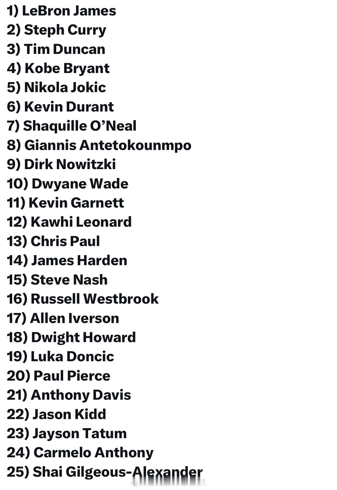 The Athletic评选21世纪25大巨星😮詹姆斯第一,总决赛击败詹姆斯3次的库里第二。