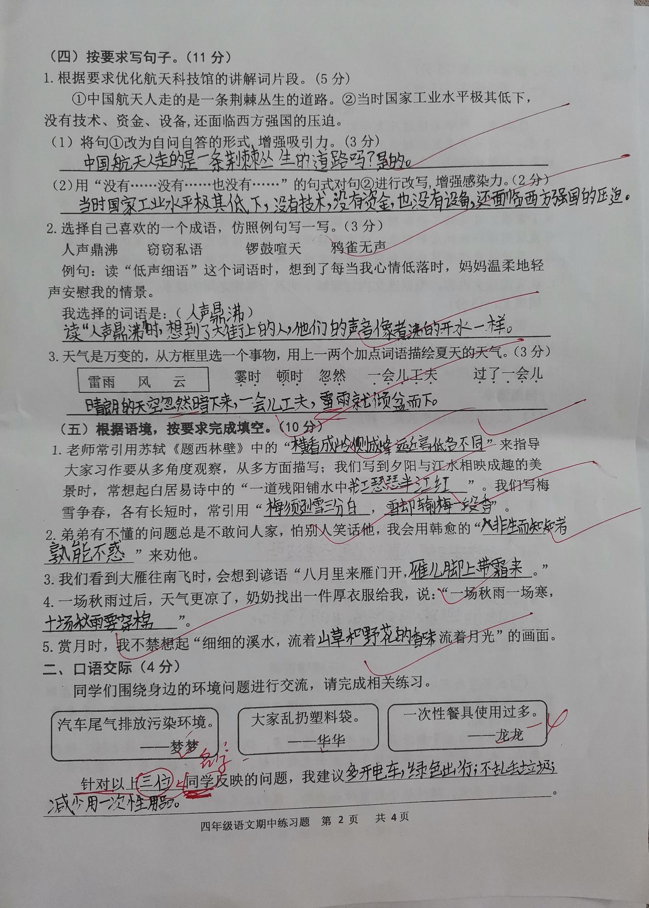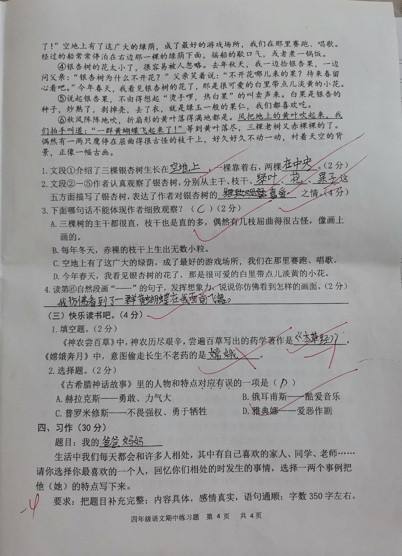 四年级儿子,语文期中考试成绩出来了,考了90分……挺意外的! 这个成绩虽然不是很好,但还是挺开心的。因为,他们班的语文成绩比较差,听我儿子说上课很吵的,在这种学习环境中,儿子还能考到90分,是不是值得开心的事?说明他没有受到什么影响。儿子说他们班这次期中考试平均分才50多分,最低分的是2分,最高分90分,80分以上有3个…… 妈呀,49个学生的一个班,考出这样的成绩,真是让老师心寒啊,替老师感到难过。儿子说,从下个星期开始,中午1:00才能放学,晚上6点才能放学。 我问为什么?儿子说因为期中考试成绩差呗,老师想帮他们补习补习,让全班同学成绩都好起来。全班同学就只有我儿子和另外一个同学不用延迟放学,儿子表示很开心。 然后我趁机引导儿子,对他说:“这是老师给成绩好的学生的特权,你不要辜负老师哦,要保持住好成绩,甚至把成绩提升到更高一层楼。” 儿子不断地点头,表示同意我说的话。这一刻,我感觉所有的付出都值了。 最后我想说的是,儿子这次期中考试基础知识扣了1分,口语交际扣了4分,课外阅读扣了1分,作文扣了4分。扣分最多的还是作文,所以作文这方面,还是要好好提升才行。 各位,你们家读四年级的孩子语文期中考了多少分呢? 斗半匠小学语文1-6年级同步作文小学写作素材积累范文大全人教版