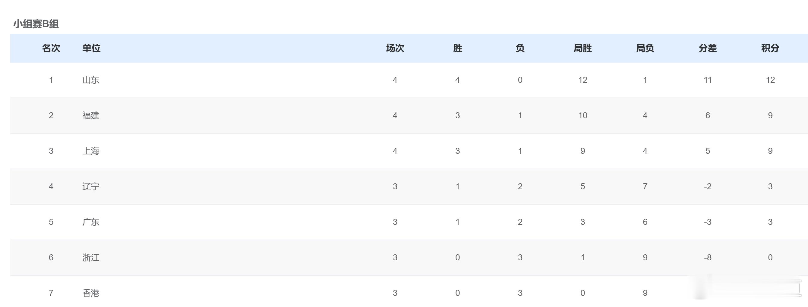 今天六场比赛全都是一面倒的3-0。目前,A组的江苏队、河南队和B组的山东队都是四战全胜,积分榜如下: