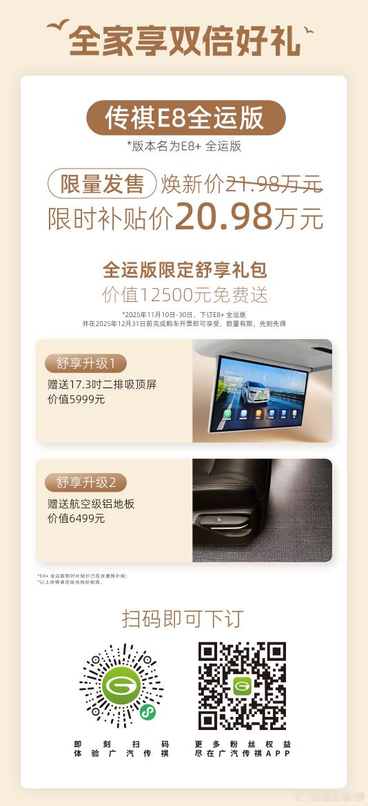 全运宠粉礼遇加码,传祺E8全运版限时补贴价20.98 万元新华AUTO:激情全运会,活力大湾区!最近大湾区的秋日,正被全运会的热潮点燃。这场在家门口举办的体育盛会,不仅汇聚了全国运动健儿的拼搏身影,更让“全家组团观赛,奔赴运动之约”成为今秋最暖的风景。作为扎根广州的本土车企与十五运唯一汽车官方合作伙伴,广汽集团既以实际行动为赛事护航,更立足对家庭出行需求的深刻洞察,量身打造专属升级车型,致敬盛会、回馈用户。11月10日,中国家用车最优选——传祺 E8全运版满爱登场。这款专为家庭用户打造的满配版升级车型,焕新价 21.98 万元,限时补贴价仅 20.98 万元。新车不仅带来全新的价值升级,更同步开启诚意十足的全运宠粉礼遇,以实力与诚意回馈用户信赖。超9万家庭信赖之选,上市2周年宠粉升级自上市以来,传祺E8始终以用户需求为核心,凭“双倍自在”“双倍舒适”“双倍守护”“双倍安心”的全面均衡实力,陪伴每个家庭共赴幸福出行生活。这份对家庭需求的精准满足,让它不仅收获了超 9 万“满爱家庭”的满分认可,还连续15个月稳居中型MPV销量冠军,达成自主插电混动MPV保值率第一,成为有口皆碑的中国家用车最优选。值上市两周年之际,为满足家庭群体对更高品质出行的期待,传祺E8全运版正式推出。在保留以往大空间、舒适、智能、安全优势的前提下,全运版新增价值超12500元的满配升级,含17.3吋二排吸顶屏与航空级铝地板套装,为20万级家用MPV市场带来满配选择,用越级实力为用户的每一段旅程加分。传祺E8宠粉嘉年华,双倍福利享不停作为十五运官方指定用车,传祺E8直接把全运福利拉满。不仅带来全新升级的全运版,更送出覆盖传祺E8全车系的丰厚购车政策,加上全运专属权益,用一场诚意十足的宠粉盛宴,让智能出行全方位守护每个家庭的幸福时光,践行“家有E8双倍幸福”的理念。2025年11月10日至11月30日下订E8+全运版,并在2025年12月31日前完成购车开票即可享受,数量有限,先到先得此外,传祺 E8 还为新老车主们准备了 E8 全运版购车权益包,涵盖十五运周边、十五运购车券及C919机票等,每一份福利都藏着对家庭用户满爱关怀,让家庭出行的幸福再添一重专属仪式感。传祺 E8 始终把用户需求放在核心位置,这份坚持贯穿车型从研发到服务的每一个环节。正如传祺E8商品总监黑晶在上市直播中所说:“做到比传统 MPV 更智能,比SUV更舒适,比轿车更能装,让‘E8’的幸福感延伸到出行的每一公里。从细节处见关怀,从体验中显温度。” 也正因这份坚持,品牌同步启动用户共创计划,面向用户征集明年E8中期改款意见,根据意见影响度提供分级购车优惠,切实回应车主对功能优化的期待。除了深度共创,传祺E8更预告今年年底将持续推送包含哨兵模式在内的多项 OTA 升级。通过优化智能交互、拓展实用功能,让现有车主的座驾持续焕新,让 “家有E8双倍幸福” 的体验长久延续,真正实现与用户深度同行、共筑理想出行体验。传祺E8全方位实力加持,打造移动幸福家 作为智电舒享大平层,传祺 E8打破传统家用车边界,在空间、舒适、智能、安全等方面实现全方位越级,以覆盖17.98万元- 23.88万元价格区间的产品矩阵,包含油电混动与插电混动两种能源形式,精准满足不同家庭的出行需求,真正实现陪伴每一个中国家庭奔赴幸福旅程。传祺E8以 “舒享大平层”重构家用 MPV 体验,用越级配置筑牢舒适基底。5.2㎡超大车内空间,可灵活切换大七座/大四座,无论是全家组团看全运,还是家长带娃户外露营,都能轻松适配。1917L 超大后备箱更能轻松容纳运动装备、露营器材等大件物品,七座下也能稳妥放置全家行李。二排双超级零重力座椅堪称“移动头等舱”,通风加热按摩三重功能加持,全家运动过后或长途观赛返程时,能快速缓解疲劳。搭配越级 NVH 静谧性调校,有效隔绝路噪风噪,让座舱成为不受外界干扰的家庭专属舒适空间。智能配置让传祺 E8 成为家庭出行的“便捷助手”,科技感与实用性无缝融合。四音区语音识别精准捕捉不同座位指令,前排调导航、后排控影音均可“能动口绝不动手”,避免行车中操作分心。同时iSPACE场景服务全面覆盖出行需求,舒缓空间缓解驾驶疲劳、小憩模式适配中途休息、影院模式增添旅途乐趣,哪怕是观赛途中的等待时间,也能让全家享受舒适时光。近期传祺E8更是不断回应车主期待,通过OTA 升级带来多重实用功能,不仅有HUAWEI HiCar 4.0无感互联,手机靠近车即自动连接,音乐、导航无缝流转,还有传祺APP云端相册自动同步车机,家庭观赛、运动出游的照片可随时分享。车机“常用常新”,始终跟上家庭出行节奏。安全与续航双保障,彻底化解家庭出行的后顾之忧。传祺E8以2.9m超长侧气帘搭配全系标配6气囊,再加上2023年中国十佳车身的硬核防护,为全家筑起全方位屏障。续航表现同样贴合家庭不同出行需求,CLTC纯电续航150km满足日常通勤,满油满电状态下可达1200km超长续航,无论是跨城观赛还是周末户外团建,都无需频繁补能,彻底告别里程焦虑,让每个家庭都能放心开启每一段远方旅程。宠粉福利持续加码,解锁双倍幸福感在以全方位产品力守护家庭出行的同时,广汽传祺更带来多重宠粉福利回馈用户。全运会期间,广汽旗下五大品牌联合推出 “冠军时刻有广汽” 全民抽奖活动,11月10日-11月20日每日抽取车辆一年使用权(价值 49999元),