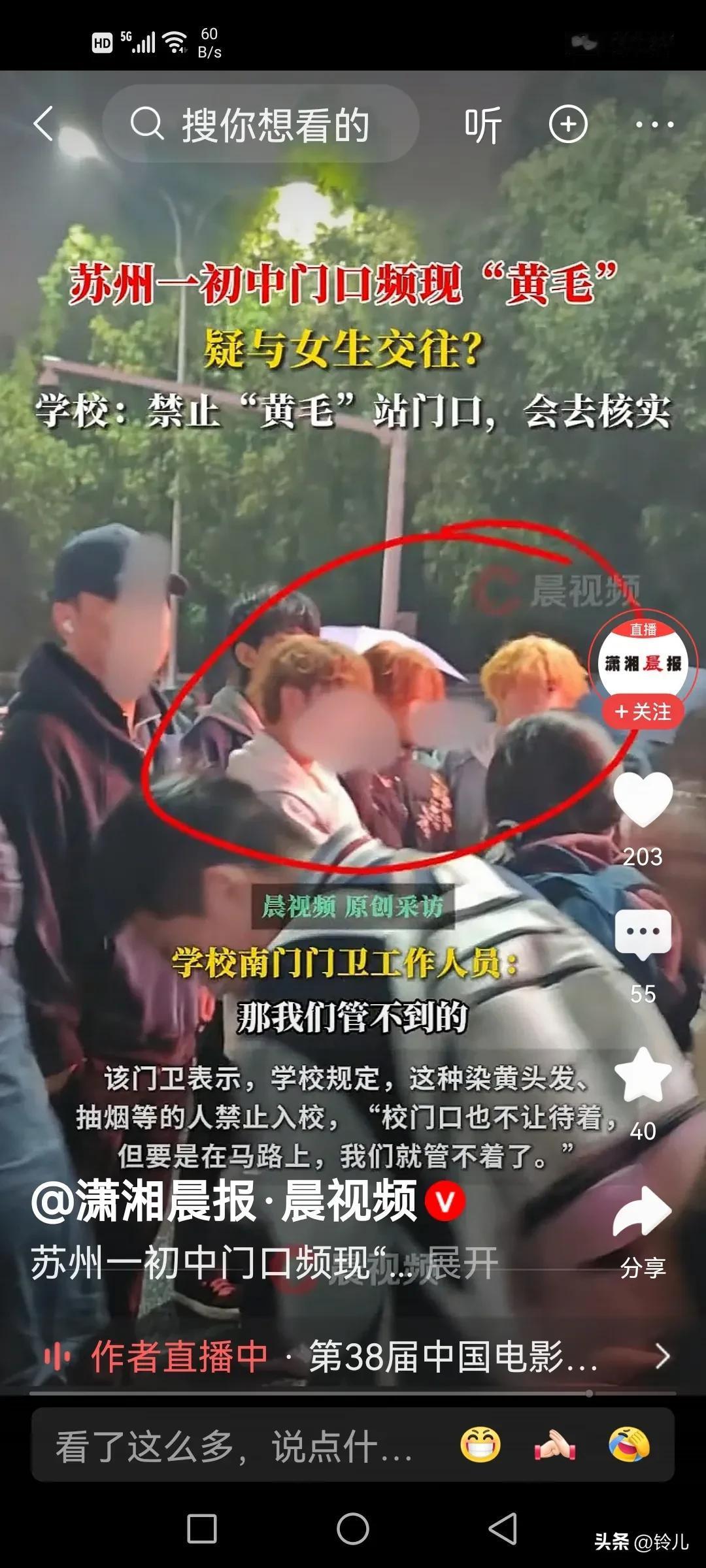 “黄毛”不一定是坏人,聚集校门口,不是等校内“猎物”也得驱散撵走,影响学生审美价值观。 近日苏州盛泽二中校门口出现黄毛抽烟骂脏的男青年公然聚集,污染校园周边风气,学校把他们赶到公路上,觉得没权利再管了。 我见到的不仅有“黄毛”还有花毛、蓝毛、白毛、灰毛、红毛,这些杂毛青年有的是美术生,有的是理发店的打工仔,有的是游手好闲的无业青年。可能还有其他人员。 我有一个学生一头黄毛,我问他染发多少钱,他说80元,一个月染一次,他妈妈在超市搞卫生,一天70元,这些孩子也不是坏,就是不懂事。他们觉得这是美,一种时尚。 让孩子远离“黄毛”是对的,这些青少年处于追求另类,奇装异服,他们内心是空虚的,作为黑头发黄皮肤的子孙,不伦不类是对中国人祖先的忤逆。