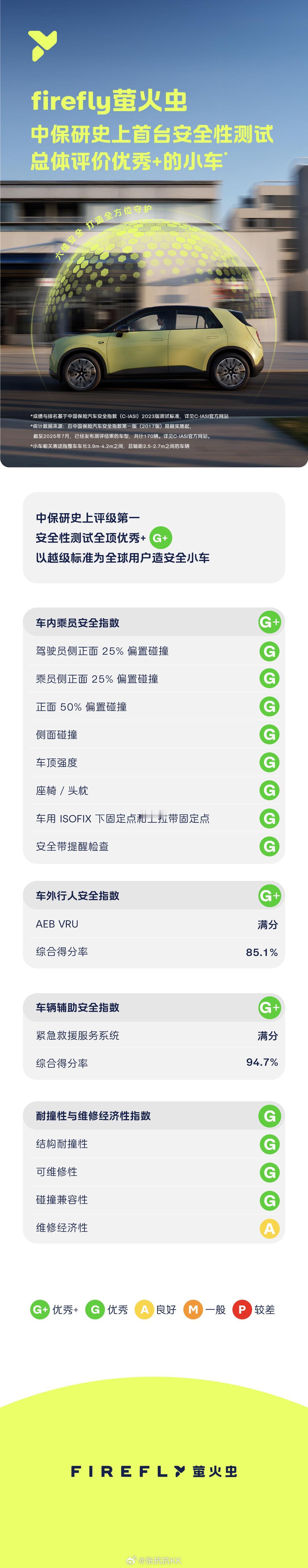 很多人心中的完美用车组合,正是“大+小”组合:一辆三排座的大SUV,能带全家远行;再来一辆灵巧的小车,城市通勤、买菜接娃都方便。尤其是后者——小车,好开、好停、省电,用着轻松自在,是一种“日常里的自由感”。 但问题也在这:车是小了,心可能就大不起来了。刻板印象中,车小就意味着头短尾巴短,碰撞时的溃缩空间小。一想到要载着孩子出门,万一出事了谁也没法承受。 安全,成了很多人买小车的最后一道阻碍。 但今天也许是一个里程碑 —— 有一辆小车,不仅证明了自己安全,还拿到了中保研几乎最强的、就连大车也不敢想的碰撞成绩:3个G+、1个G。 G+是什么概念?说这个,还得说它的老大哥蔚来EC6。几年前,EC6在中保研的碰撞测试中,安全三项也是创纪录的“小项全满分”——三个G。 但那时候还没有G+,只能把大项拆成中项,中项拆成小项,一层层去看,才知道它到底有多卷。后来中保研才加了“G+”这一档,像是专门为这些“被G限制了上限”的车准备的。 现在,萤火虫也进了这个段位。而且,比当年更难。规程升级了,副驾也要撞,壁障更重、撞击点更高。对一辆车长只有4003mm的小车来说,几乎是“地狱难度”。而这次,能和它并列的,只有问界M9和乐道L60——都是比它大两圈的车。 实话实说,萤火虫能拿G+,不管是横向比还是纵向比,都更难。横向比,它比问界、乐道更吃亏;纵向比,它比当年的EC6面对更高门槛。 而它不仅三项安全拿到G+,就连大家最容易忽视的“耐撞与维修性”也拿到了G。这项一般能拿个M就算不错了,很多车为了前面几个G+,干脆就不管这项了。但萤火虫四项全做到了,是从工程逻辑上真正“不偏科”。 怎么做到的?也不展开强讲了,我们就一项说一个点举例吧: - 被动安全方面,最难的小偏置碰撞,A柱没有变形,乘员舱结构完整,生存空间还很充足。这是很多大车都会出问题的环节,小车能扛住,说明结构是真的硬。其实也可以看看它的气囊,展开后几乎充满整个座舱,鼓鼓的,像穿了一件大棉袄——这可真舍得用料啊!买车的钱没白花,这下看得一清二楚。 - 主动安全方面,前面看的是“钢筋铁骨”,这里就看“聪不聪明、灵不灵巧”了。像行人AEB、车道保持、DMS,它几乎全是满分,每一项都能准确识别、及时触发、跑通流程。 - 行人保护这一块,可以说是“从顾自己,到顾别人”。它对电瓶车、行人这类目标的识别和刹停都做得很到位。 - 再说维修性,这一项很多车其实是主动放弃的。但萤火虫的前纵梁吸能结构做得很好,撞完之后不至于一修就整车报废。这也意味着:入手成本不高,特别是 BaaS 之后更轻松;持有的维修、保险成本也不高,是真为用户着想的那种车。 最后两个感受: 第一,过去我们说蔚来有安全基因,是因为它有大车的底子;现在,这个基因已经延续到了小车上。安全 = 蔚乐萤的基因。 第二,这一代技术平台是真的强。以前做安全多少是取舍,而现在,它尽可能地做到了“尽要又要”——安全、空间、智能,全都兼顾。【来自懂车帝车友圈】
