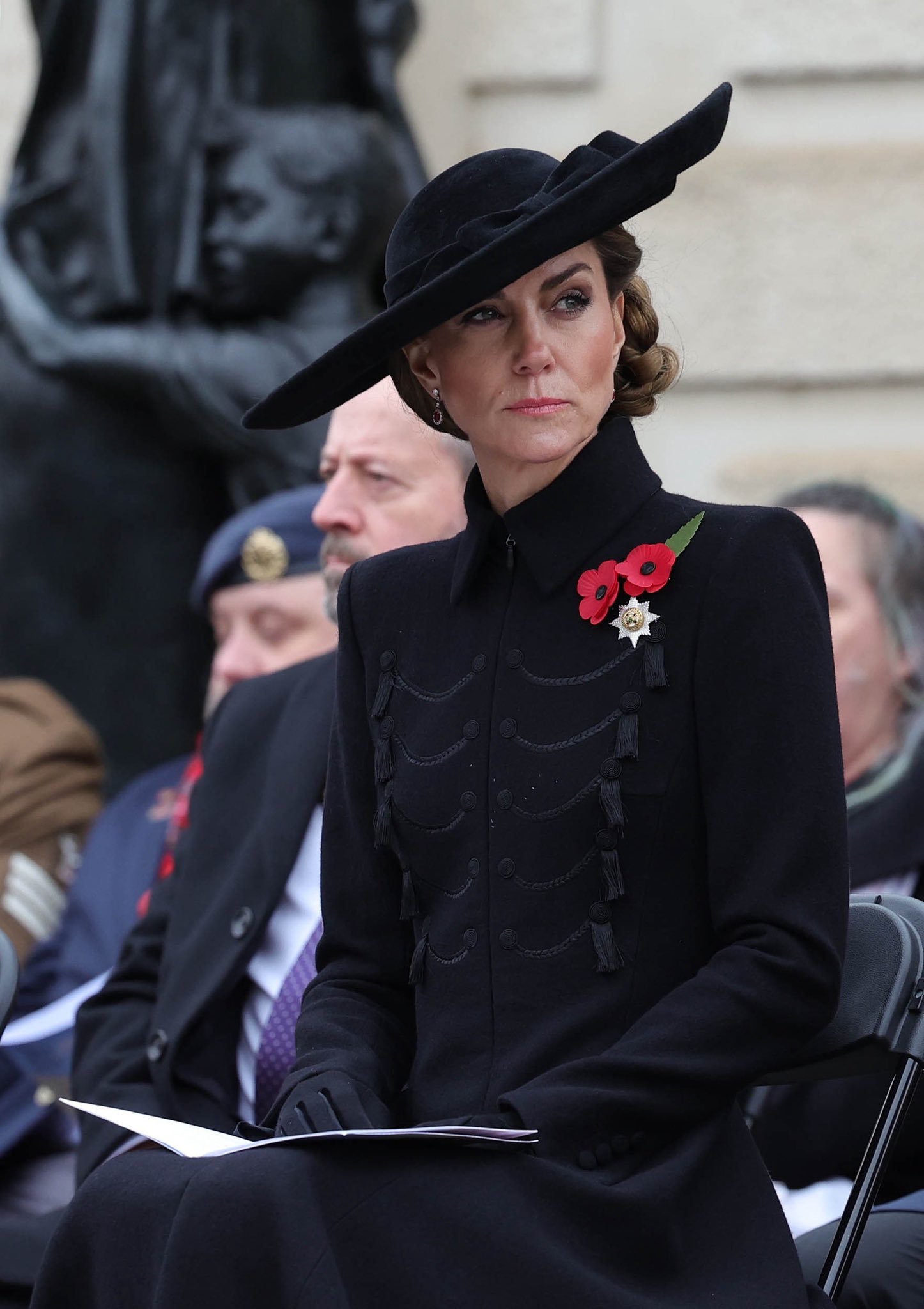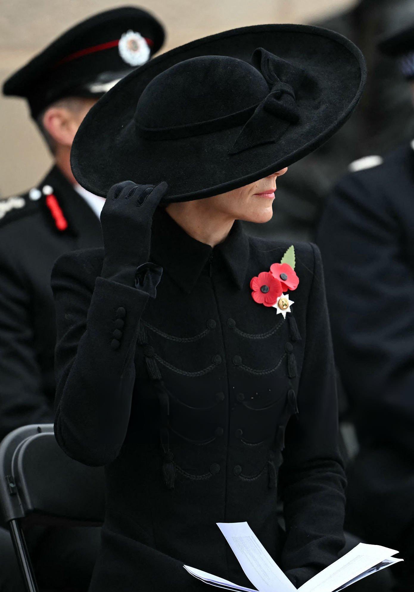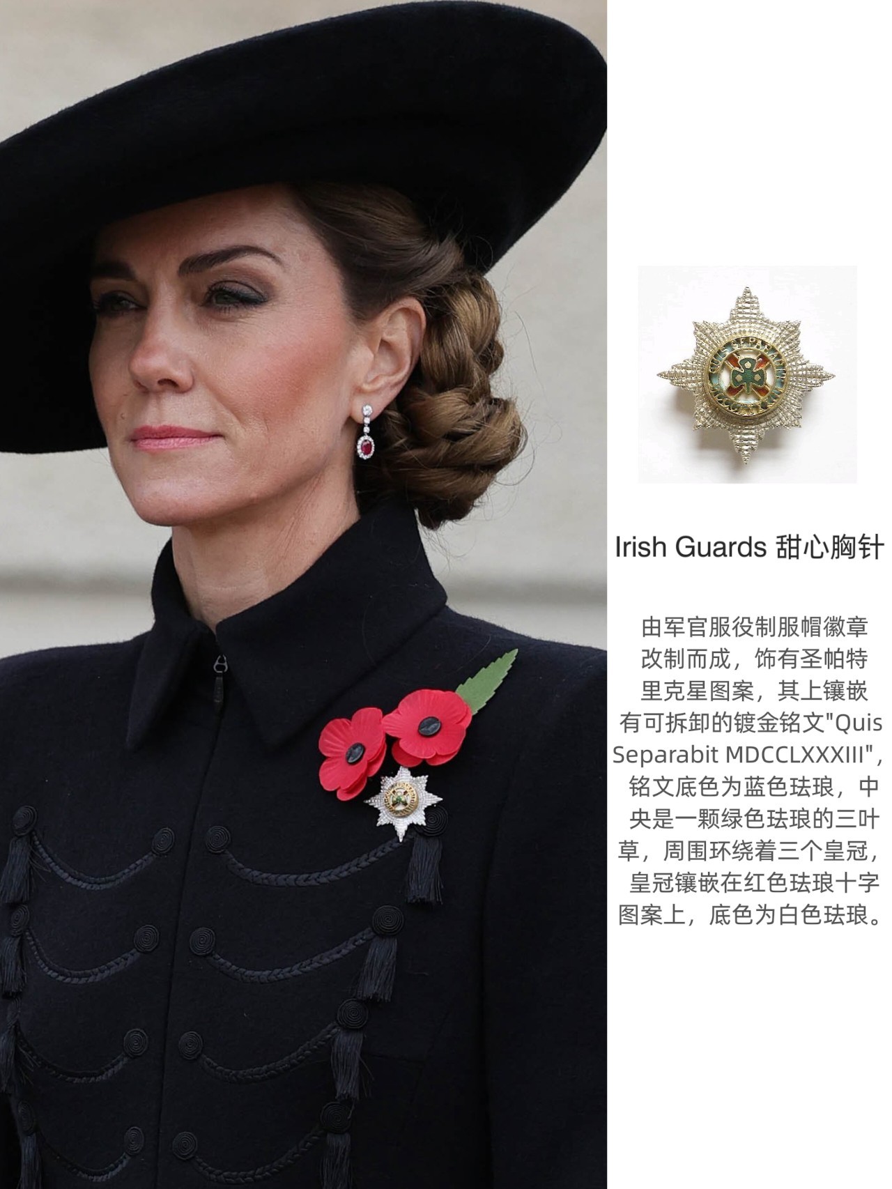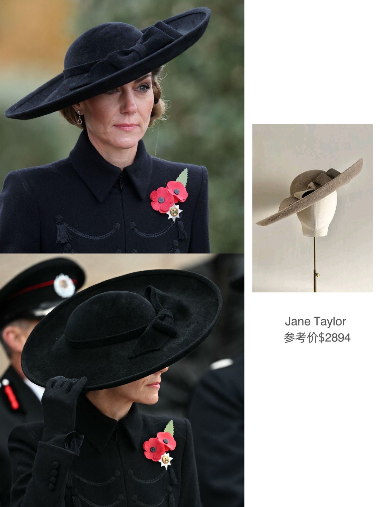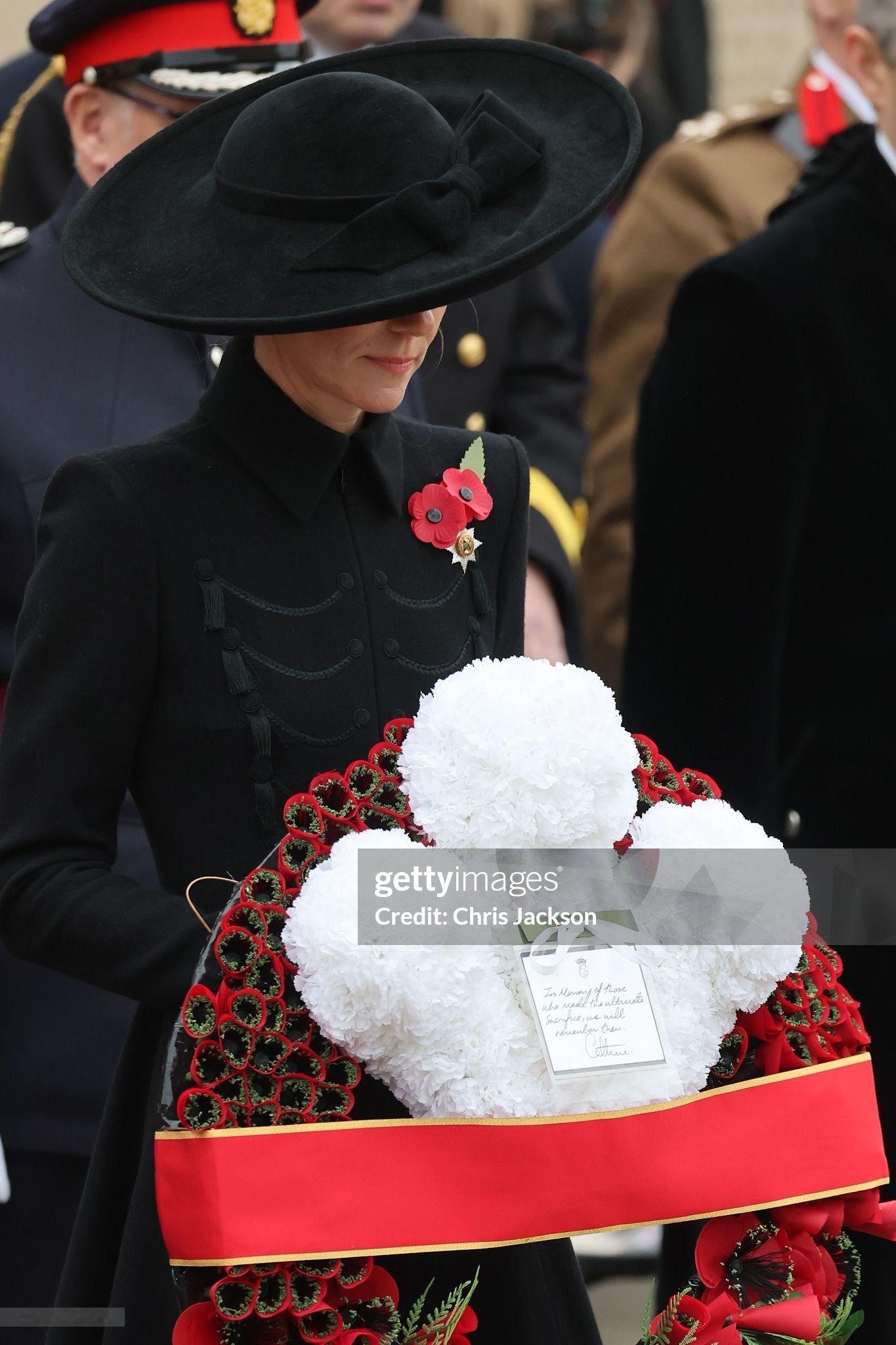 出席停战日纪念活动的LOOK~这件军装风黑色大衣裙是来自Catherine Walker,凯特19年以及23年出席在阵亡将士纪念日活动时有穿过两次,但因为都是阳台照,均未有全身LOOK……这次终于看到“全貌”了,相比于原版,做了加长~所佩戴的宽檐蝴蝶结礼帽则来自Jane Taylor,搭配了她的GR长靴,胸前是有佩戴爱尔兰卫队甜心胸针,红宝石钻石耳坠之前是有佩戴过两次