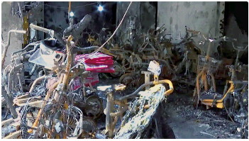 那么,究竟是什么原因造成15人殒命火场呢?调查组在火灾现场调查了解到,事发当时,整个架空层共停放有120多辆电动自行车,记者在现场看到,这120多辆电动自行车全部参与了燃烧。由于住户在外窗采光通风天井内搭建了一个置物架,并堆放了大量可燃物,高温有毒烟气从采光通风天井上来后引燃住户外窗的可燃物,迅速突破外窗,继而引燃室内可燃物,大量高温有毒烟气涌入室内。