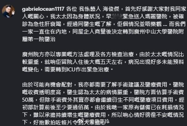 【On.cc】海俊傑現身交代太太病情 逐一解釋盼釐清誤解藝人海俊傑上周六(8日)忽然聲淚俱下拍片,公告其化妝師太太莫家慈患急性肝硬化,於內地醫院急需籌錢70萭元換肝,引爆全城關注,令人擔心。事隔數日,海俊傑終於再次現身網絡,發文交代太太病況,並親解急需百萬醫療費及上廣州求醫原因。海俊傑太太莫家慈患急性肝硬化。海俊傑日前聲淚俱下拍片,嚇親大家。佢提到自己一家一直住內地,所以同屋企人商量後,決定轉到廣州嘅醫院醫治太太,不過太太情況比較嚴重,留院入住後大概五日左右,病況出現好多未能預料嘅變化,需要轉到ICU作出緊急治療,佢自己亦都受打擊下拍咗片放上網,搞到大家咁擔心:「由於可能有機會配對,我亦都需要了解手術建議及醫療費用。醫院嘅收費透明度高,醫生認為太太的病情嚴重,醫院方面估算手術費50萬,但除手術費外其實亦都會繼續衍生不同嘅醫療項目費用,經初部計算前後至少要過佰萬。由於我哋一家原有儲備已在耗損情況下,難以承擔持續增生嘅醫療費用,所以喺心情好徬徨不安嘅情況下,好抱歉拍咗條片令到大家擔心。片段出街之後有好大嘅回響,收到好多人嘅支持同關心。特別感激公司 天盟娛樂培哥,演藝人協會,會長古天樂先生,曾志偉先生,以及好多圈內外好友的幫忙,感激不盡。」佢亦表示太太狀況每日需要同醫護團隊協調同部署,佢目前為止亦只可以同大家分享到呢個狀況,盼釐清誤解,並再次感謝各位對呢件事嘅關注,多謝幫助過佢哋嘅人,希望大家可以繼續為佢太太禱告,並祝福所有人都要身體健康。海俊傑表示自己徬徨不安下先會拍片。佢表示依家仲要日日留意住太太病情。