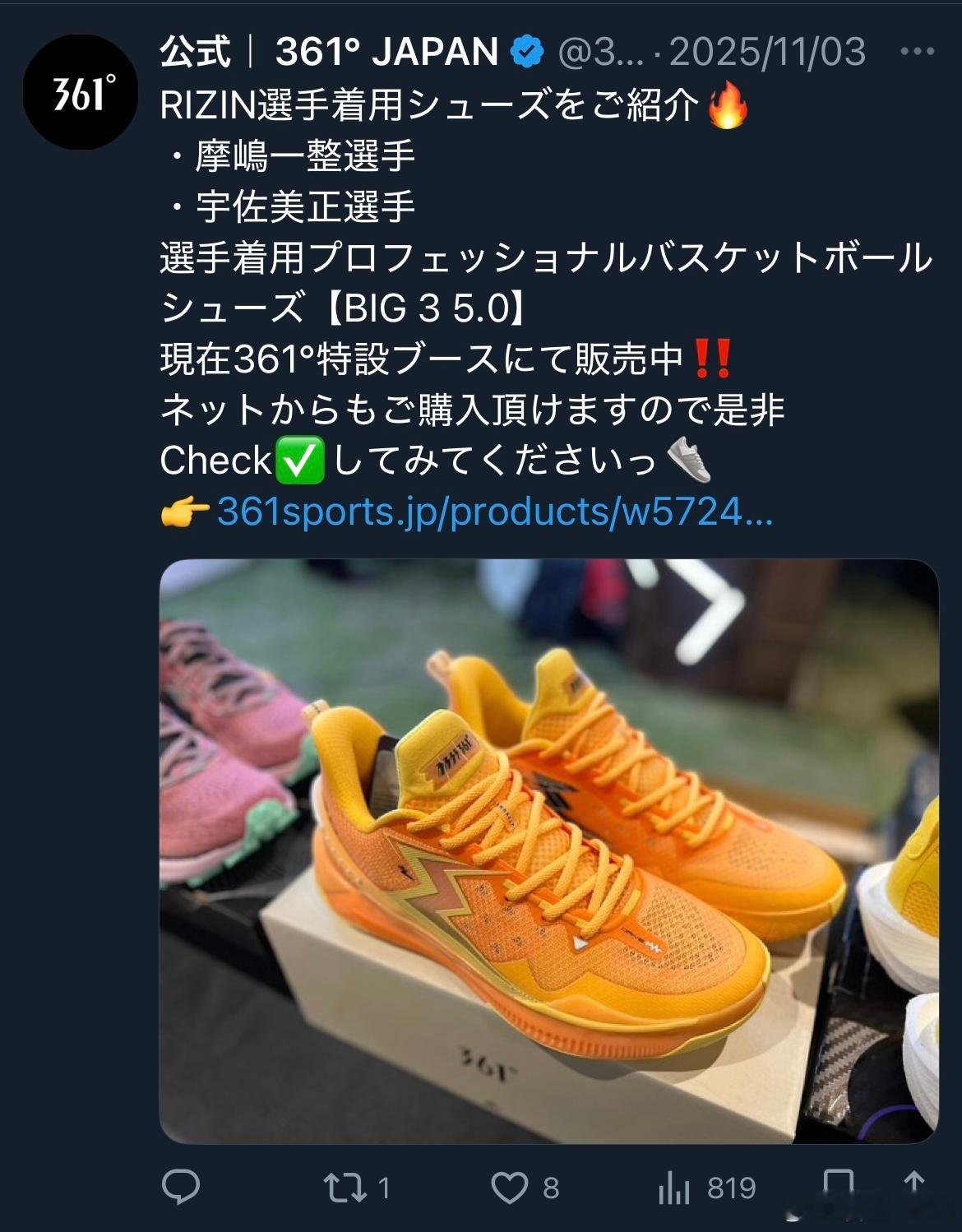 那天看直播的时候我就觉得有点奇怪,rizin的裁判怎么穿的361°的衣服。结果查了下,确实是361°跑去跟rizin合作了。说实话虽然rizin在日本人气很高,但是361°自己连格斗用具的产品线都没有。赢了的选手送一双361°的鞋,还是篮球鞋,难不成还指望他们能穿出来吗?结果到头来361°日本的这个推特账号的fo就400多个人,这宣传了个啥?