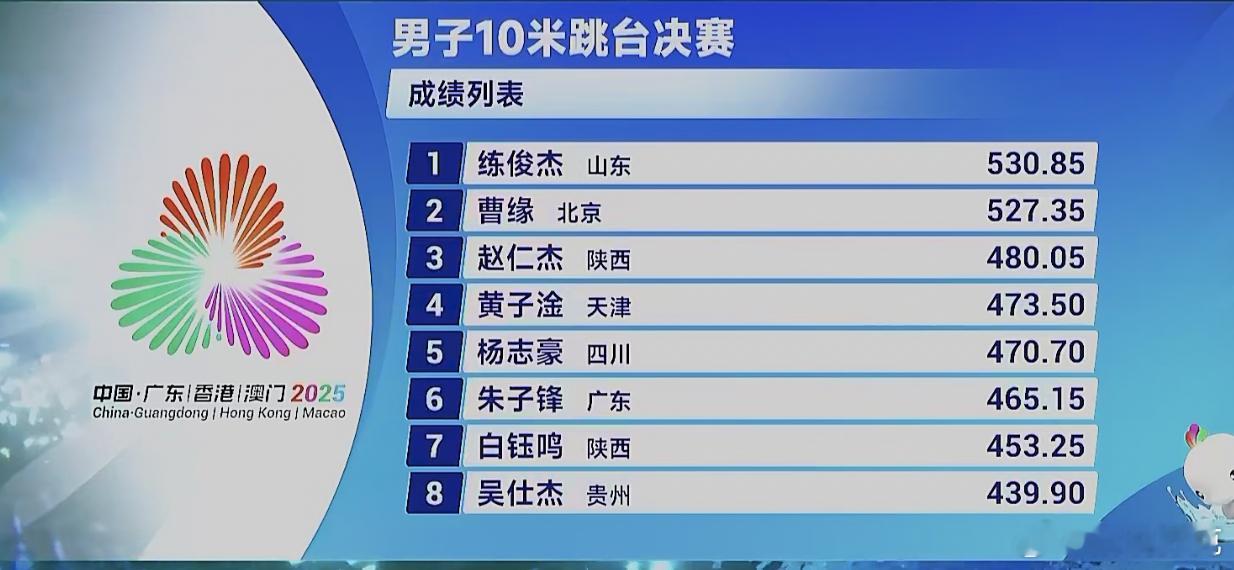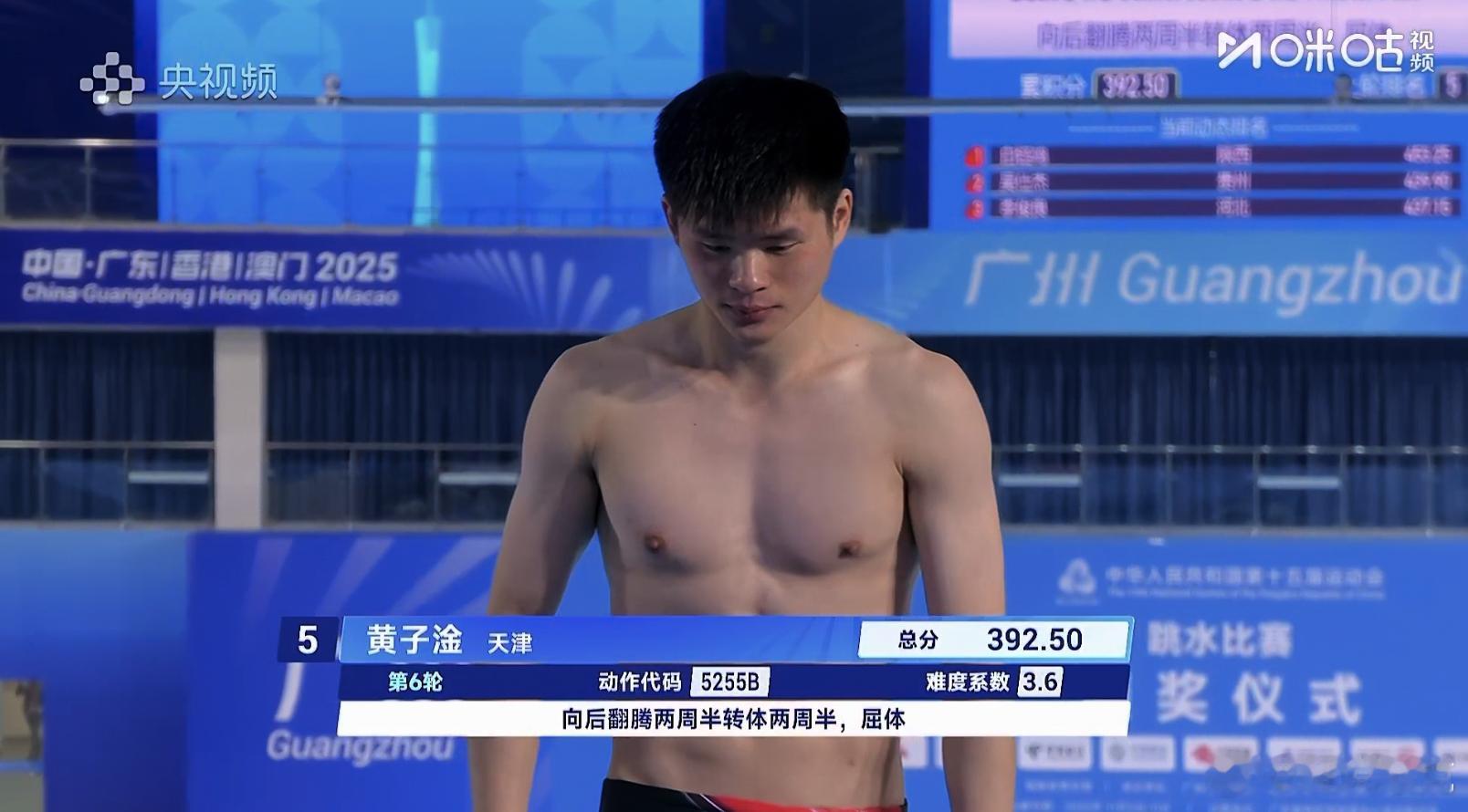 男子十米台巨好看!!!!练俊杰最终拿下金牌,曹缘第二。关键练俊杰最后一条109C直接楞干……天津队黄子淦遗憾第四,207B没整好,但今天已经很棒了!!!!多提一嘴,黄子淦在上一届全运会拿到双人跳台银牌,实现了天津男子跳水在全运会历史上的第一枚奖牌!奖牌0的突破。当时的教练教是谭良德。有空各位可以了解一下这位谭指和他的爱人。也可以请 狼哥给大伙讲讲,他们的故事。