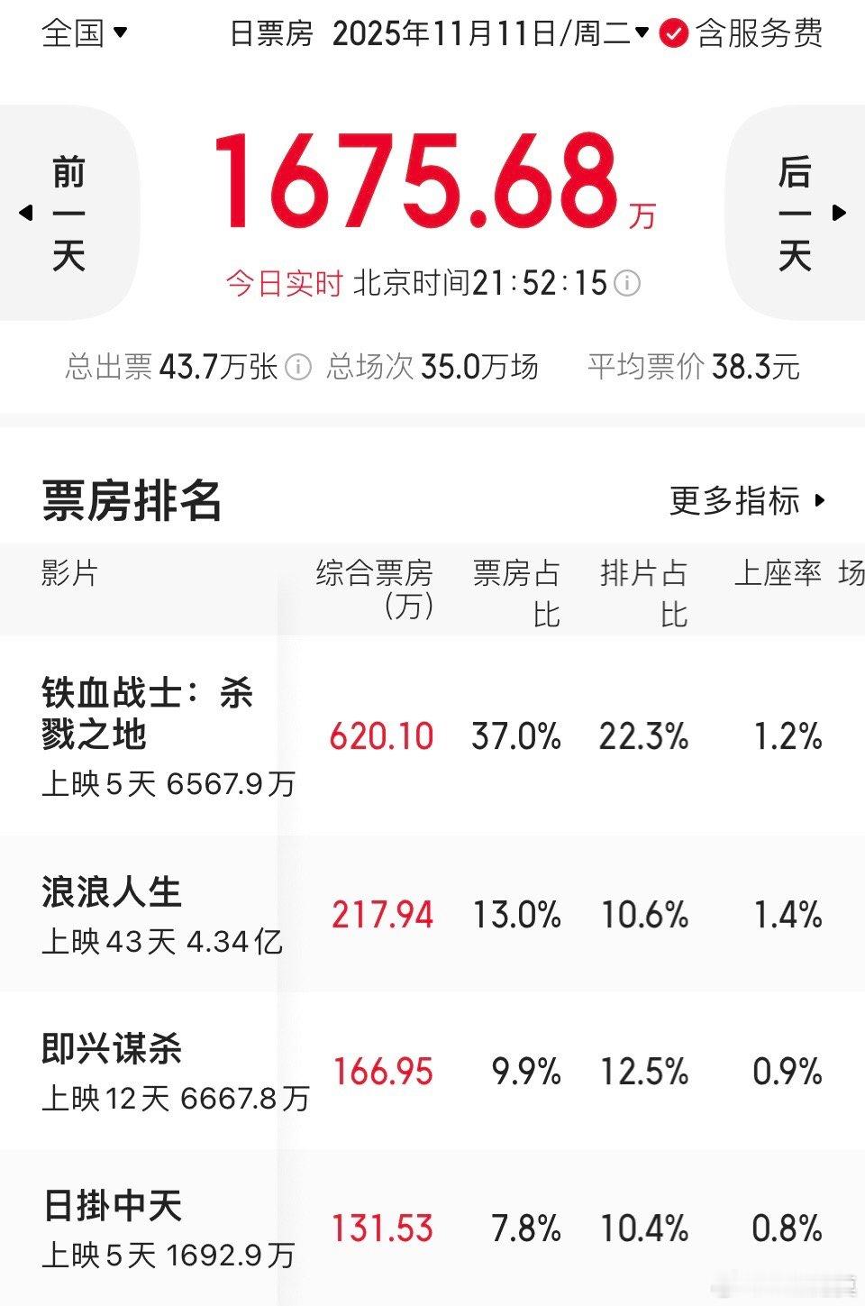 《浪浪人生》值得更多排片。《浪浪人生》上座率一直领先,天天正挂(没有倒挂),值得更多排片。有的影片自上映以来就一直在倒挂,上座率也拉胯,但排片率却和《浪浪人生》差不多。