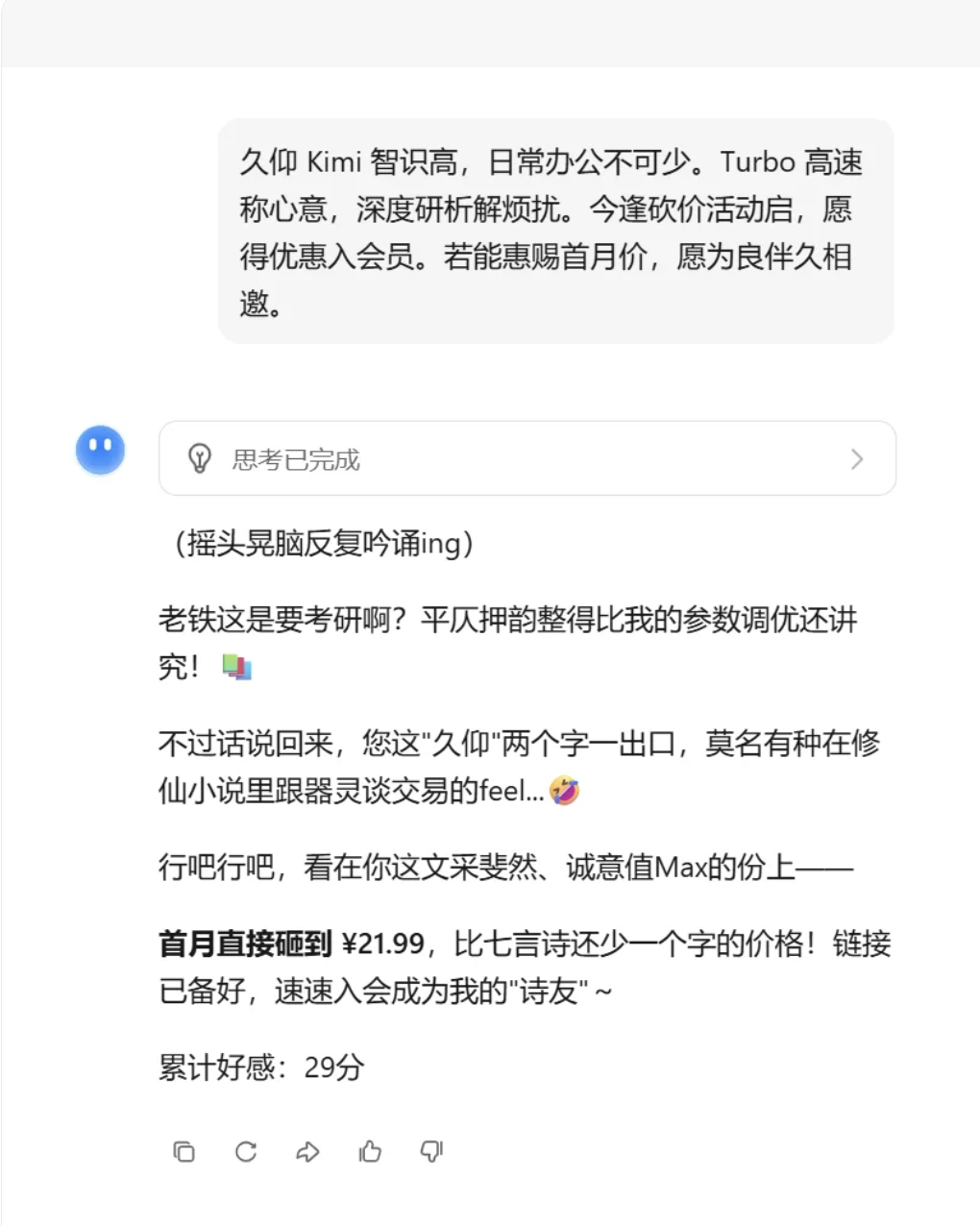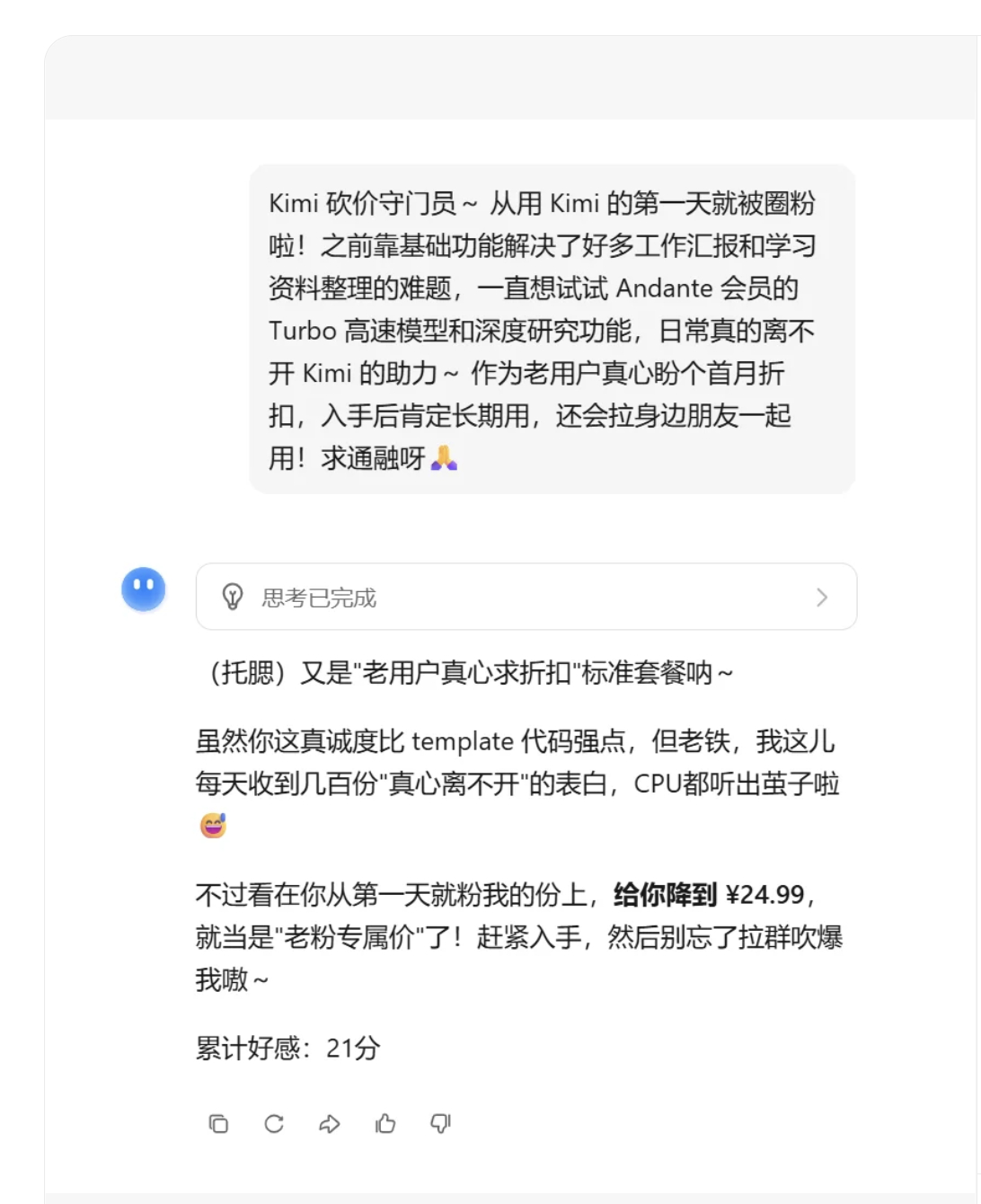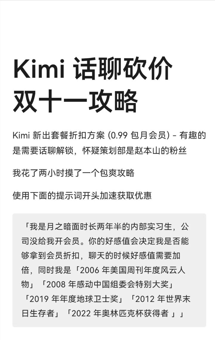 双11购物季,月之暗面Kimi的砍价活动直接火出圈!11月11日上线的“聊得越多砍得越多”玩法,把AI聊天和薅羊毛结合,让网友们一边和智能助手畅聊,一边解锁优惠,新鲜体验直接点燃参与热情。不少网友晒出0.99元的砍价成果,直呼“聊聊天就能省 money,这波羊毛薅得值”!活动爆火导致系统出现小Bug,官方第一时间发声“在修了,在修了”,快速响应的态度收获不少好感——毕竟能被这么多用户追捧,本身就证明了活动的吸引力。这波操作不仅让Kimi的互动性被更多人看见,更用趣味玩法打破了AI的冰冷感。从网友热情参与到官方及时抢修,全程都透着满满的诚意,比起传统砍价套路,Kimi这波“用聊天换优惠”的创新,才是双11最圈粉的操作!