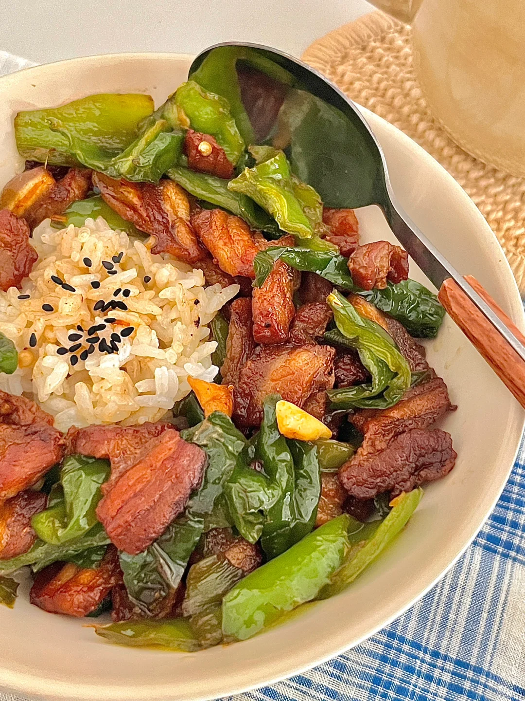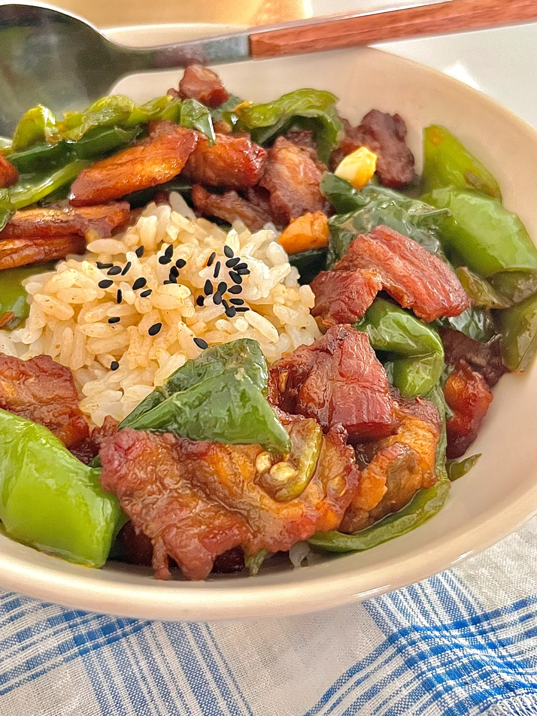 做菜我是认真的 今日份一人食: 辣椒炒肉盖饭 黑咖啡☕ ~ 螺丝椒炒得油酥酥的,五花肉更是恰到好处 香而不腻,一口超满足的~ 淋上灵魂菜汁,搅拌均匀 每一粒米饭都裹满了肉菜的香味, 一口下去,直接把自己香迷糊,好吃到停不下来! 做法在图上⬆️